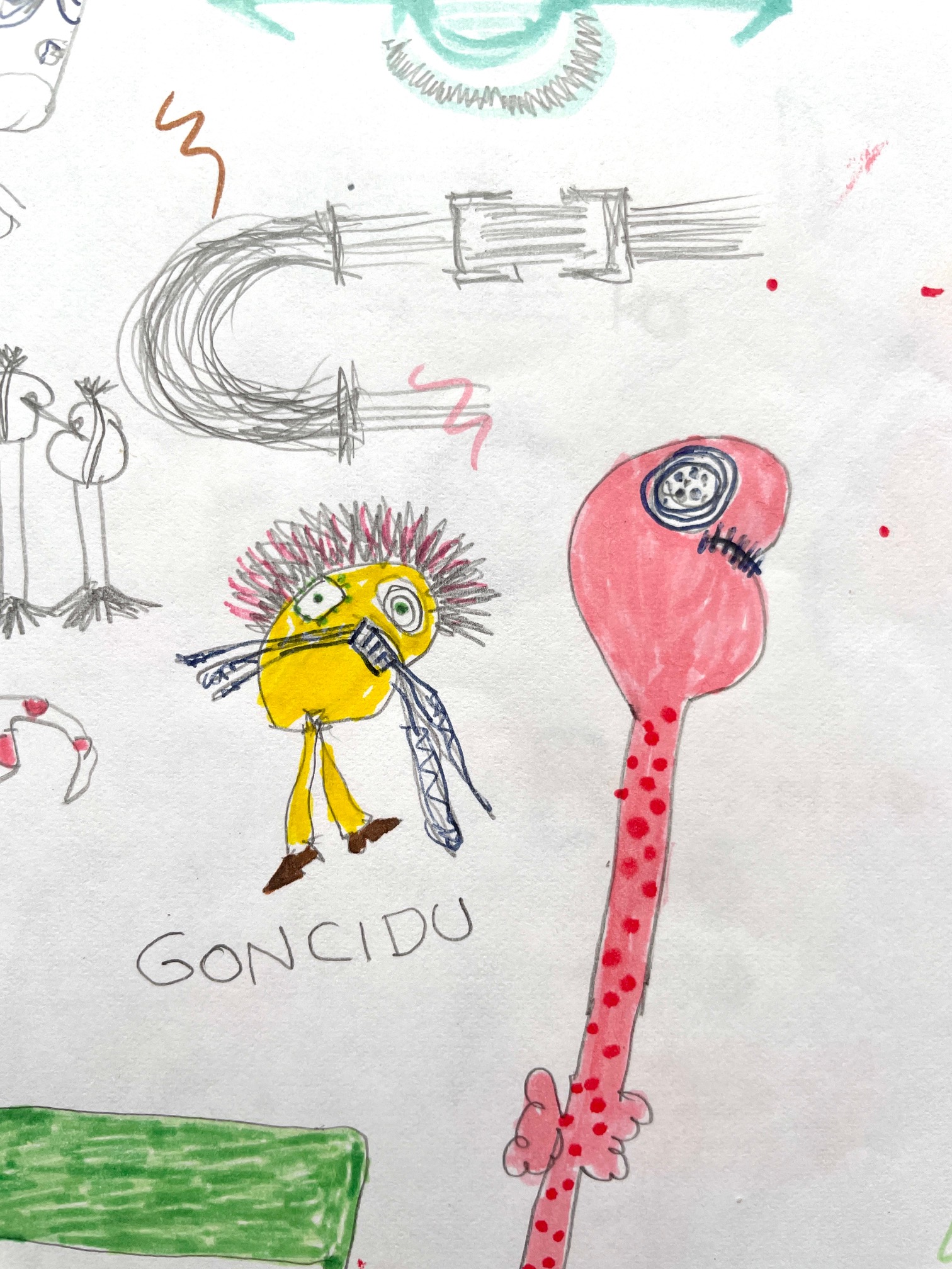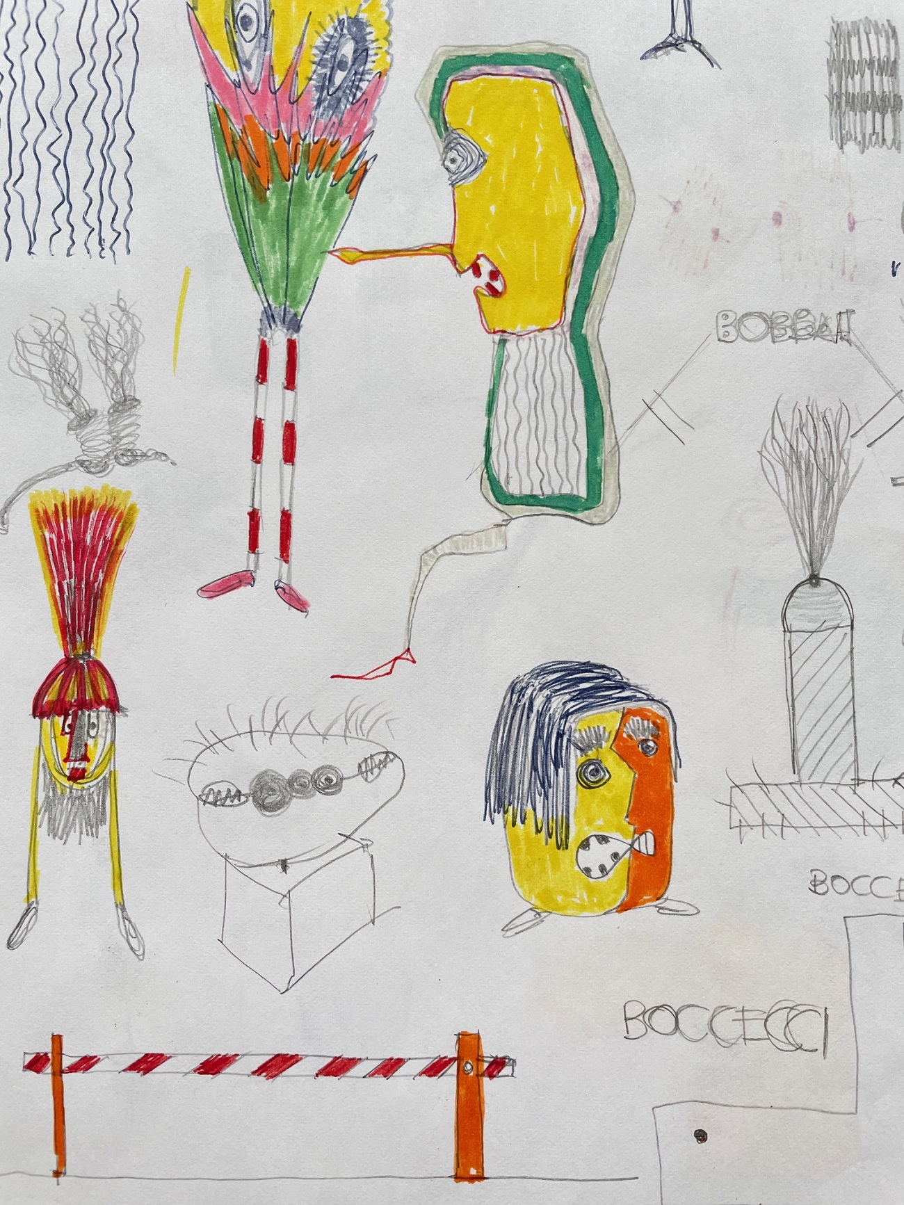 Alla dimensione dell’automatismo psichico pare facciano riferimento, invece, le carte di Giorgio Urgeghe. Fogli sparsi, spesso distanti nel tempo ma non nella prassi operativa che sembrerebbe un vero e proprio regressus ad uterum, una scrittura automatica per immagini tracimante da un immaginario semplificato e “antigrazioso” in una sorta di incontrollato horror vacui. Formalmente contiguo al linguaggio infantile o a quello degli alienati mentali, quello di Urgeghe è, tuttavia, un “brutalismo” solo in apparenza irrazionale e la folla di personaggi violenti e aggressivi, l’affastellarsi di improbabili oggetti e/o progetti in fieri, rivelano un’incontenibile esuberanza creativa e, insieme, una precisa mappatura interiore, per non perdersi nella nebbia.