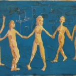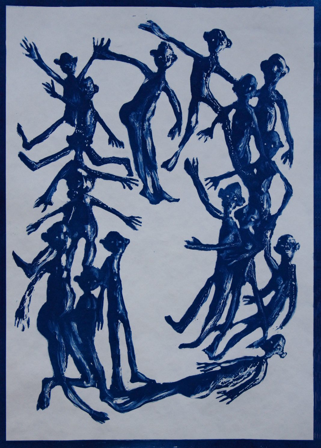 Infine Silvia Cara, che in mostra crea un contrappunto visivo anzidetto, una liaison necessaria ad amalgamare i linguaggi affatto differenti dei tre artisti anagraficamente più maturi. Le carte, ora disegnate con pastelli a olio o ad acquerello, ora frutto di collage o impresse mediante cianotipia, sono letteralmente invase da piccoli omini, che conferiscono alle singole tavole un ritmo interno pulsante, frenetico, a prima vista casuale ma, in realtà sapientemente calibrato che fa il paio col più ampio ritmo cromatico determinato dall’accostamento e dalla composizione delle diverse tavole. L’artista – forte della sua giovane età ma consapevole di vivere incartata in una dimensione nella quale i concetti di massa e individuo confliggono – produce un sorprendente arabesco contemporaneo in linea con le più avanzate ricerche di certo graffitismo metropolitano e ci ricorda che, in fondo, un disegno altro non è che «un’idea con intorno una linea» (Bruno Bozzetto).