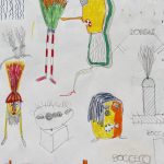 Alla dimensione dell’automatismo psichico pare facciano riferimento, invece, le carte di Giorgio Urgeghe. Fogli sparsi, spesso distanti nel tempo ma non nella prassi operativa che sembrerebbe un vero e proprio regressus ad uterum, una scrittura automatica per immagini tracimante da un immaginario semplificato e “antigrazioso” in una sorta di incontrollato horror vacui. Formalmente contiguo al linguaggio infantile o a quello degli alienati mentali, quello di Urgeghe è, tuttavia, un “brutalismo” solo in apparenza irrazionale e la folla di personaggi violenti e aggressivi, l’affastellarsi di improbabili oggetti e/o progetti in fieri, rivelano un’incontenibile esuberanza creativa e, insieme, una precisa mappatura interiore, per non perdersi nella nebbia.