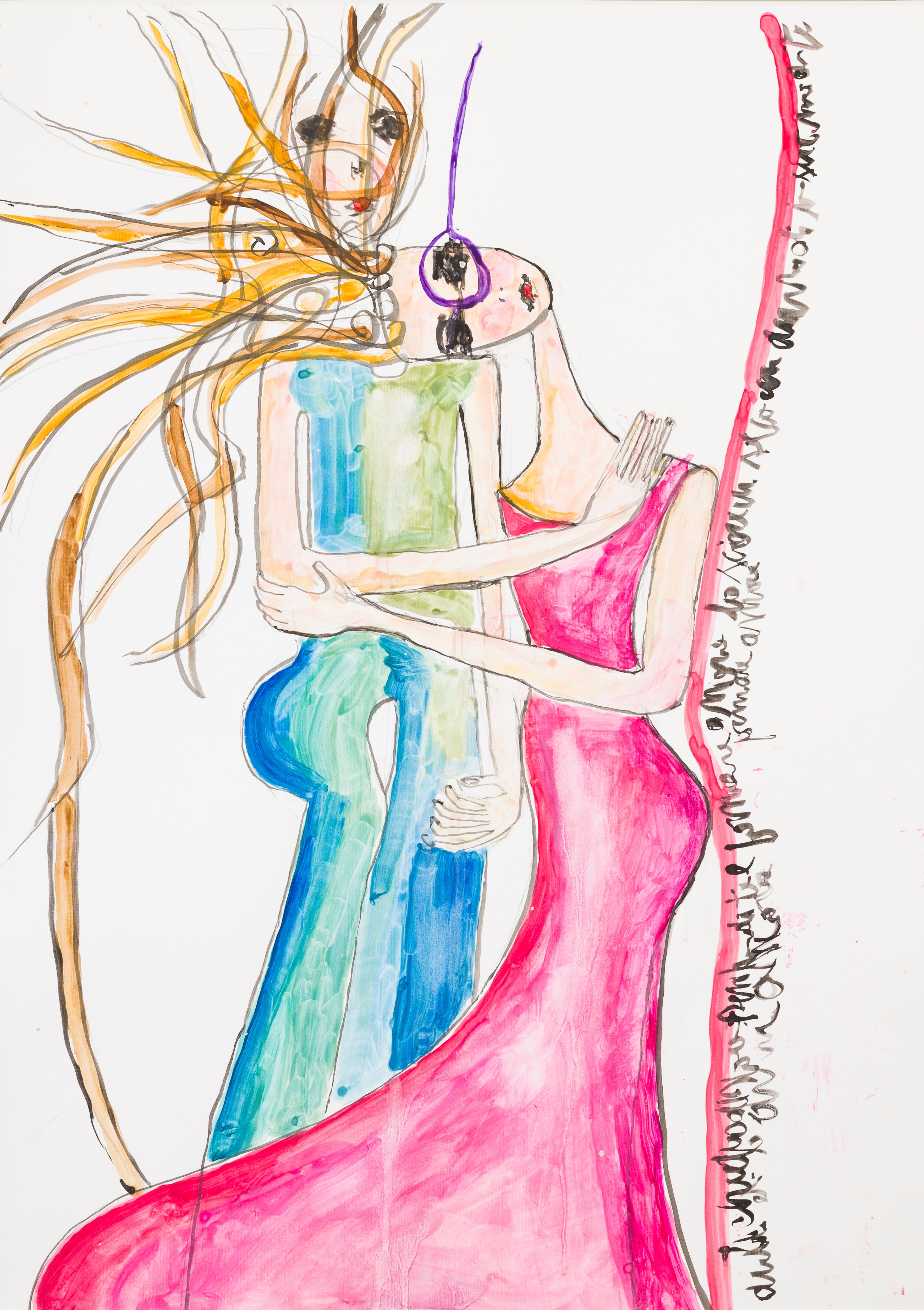 L’esordio del percorso, strutturato come una sinfonia in tre “movimenti” legati tra loro, è affidato agli acquerelli di piccolo formato, da considerare poesie essi stessi: un’elegia di colori e sentimenti che rappresentano il contatto tra corpi di ogni sesso età razza genere specie.