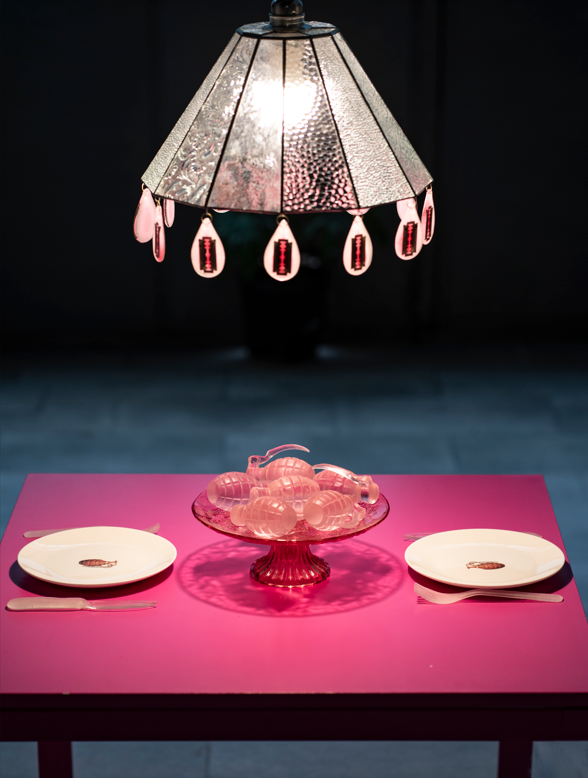 In un ambiente rosa, seducente e innocente solo in apparenza, lame e utensili in vetro raccontano la distanza tra ciò che mostriamo e ciò che viviamo. Ogni oggetto diventa una confessione, un pensiero non detto, una traccia del quotidiano che si spezza. Il ritmo della giornata – preparare il caffè, apparecchiare, sparecchiare – si trasforma in un rituale che parla di potere, cura, controllo e resistenza.