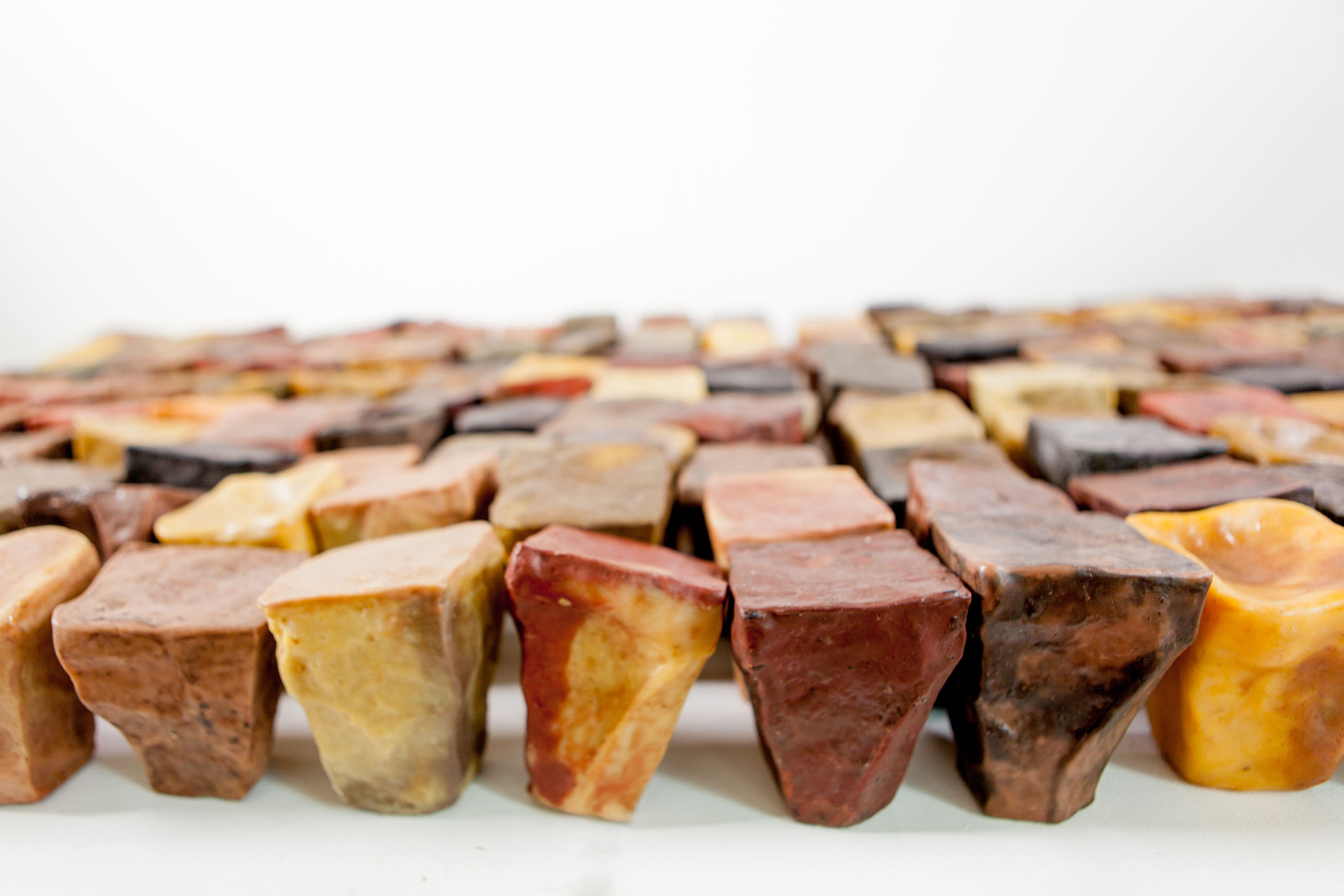 La riflessione sul limite assume una dimensione storica e simbolica nell’installazione Ad Artemisia Gentileschi, dedicata ai 184 giorni del processo per stupro subito dalla pittrice seicentesca: 184 sanpietrini in cera, modulati cromaticamente, traducono il tempo giudiziario in memoria visiva ed emotiva.