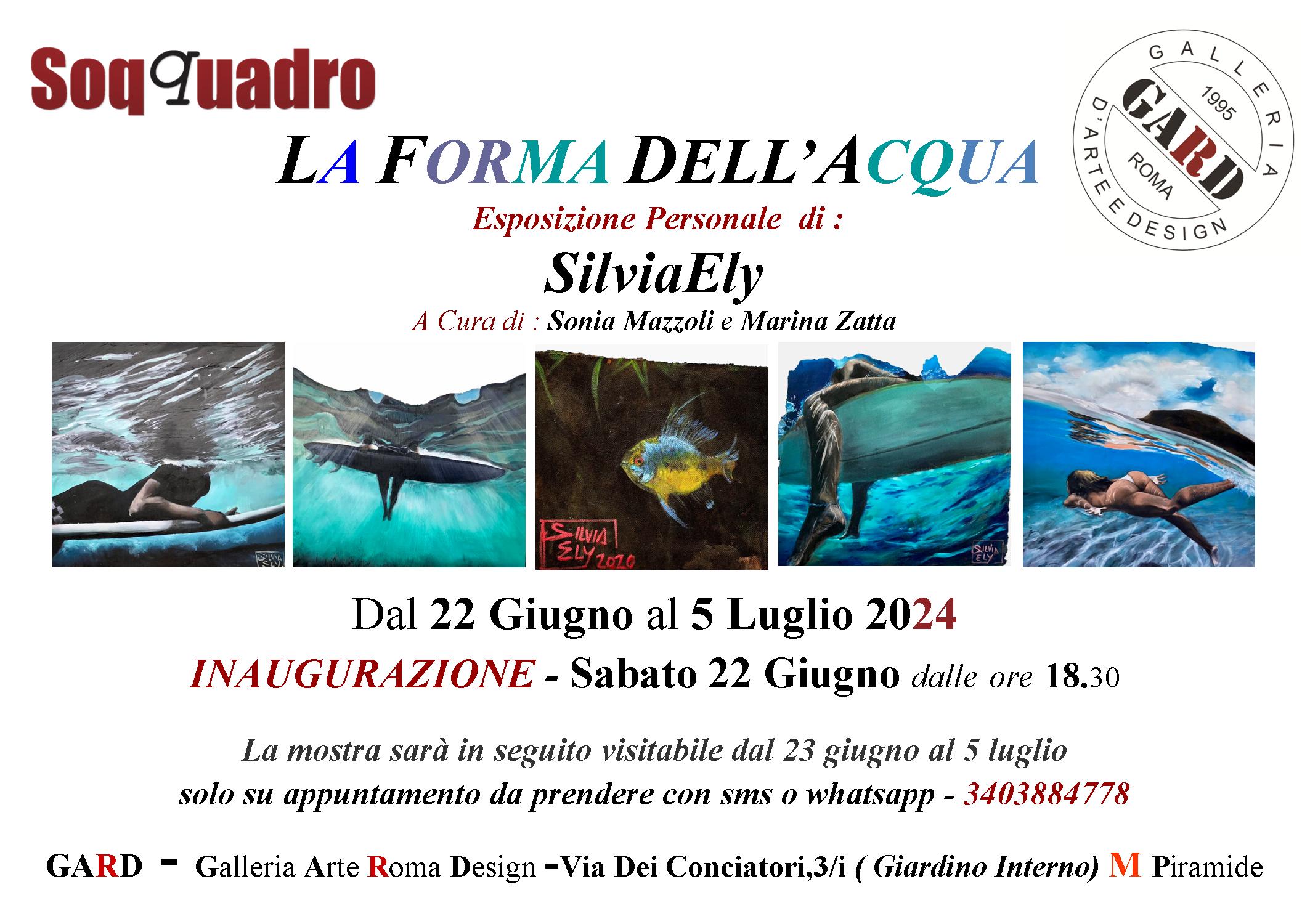 La GARD Galleria Arte Roma Design è lieta di presentare l’esposizione personale "La Forma dell'Acqua", una mostra d'arte dell'artista canaria Silviaely. L'inaugurazione si terrà il 22 giugno 2024 dalle ore 18:30 alle 22:00 “ ingresso libero “ presso la Galleria GARD, situata in via dei Conciatori 3/i (interno cortile), zona Piramide Cestia - Roma. L'esposizione rimarrà aperta fino al 5 luglio 2024, sarà visitabile dal 23 solo su appuntamento da prendere via sms o whatsapp al +39 3403884778