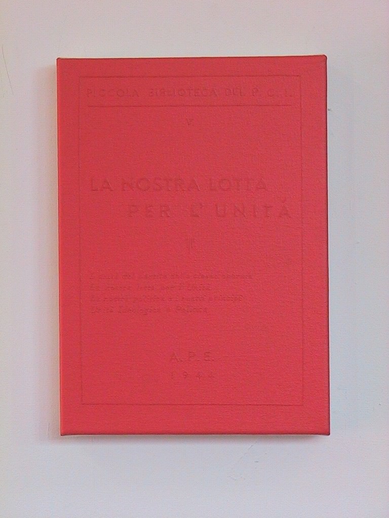 10 quadri rossi – 7 piccoli e 3 grandi. Ciascuno rappresenta un libro-opuscolo con una tonalità di rosso diversa. Il testo-base, come quasi sempre nei suoi dipinti-libro, è reso più scuro ma solo di una tonalità rispetto allo sfondo.