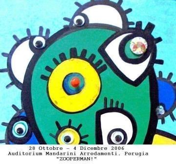 ZOOPERMAN , il fratellino occidentale neo-pop per eccellenza vicino a quelli di Takashi Murakami, attraverso 20 tele racconta quella visione mistica che tutto analizza, alla sua maniera, nella vita di tutti i giorni: a volte tocca proprio a me, zoo-condicio, sottosopra-piccole cose da niente, caduta libera, diario di uno zoo del tutto personale, muccapezza, lo zoo c'è, zooizzati, consecutio zoo, 34 anni e non sono ancora morta, hasta sempre zoo, le ombre belle, zoo_climbing, non tutti sanno volare, non è mai troppo-tardi per uscire dalla gabbia..., ma chi è?!?