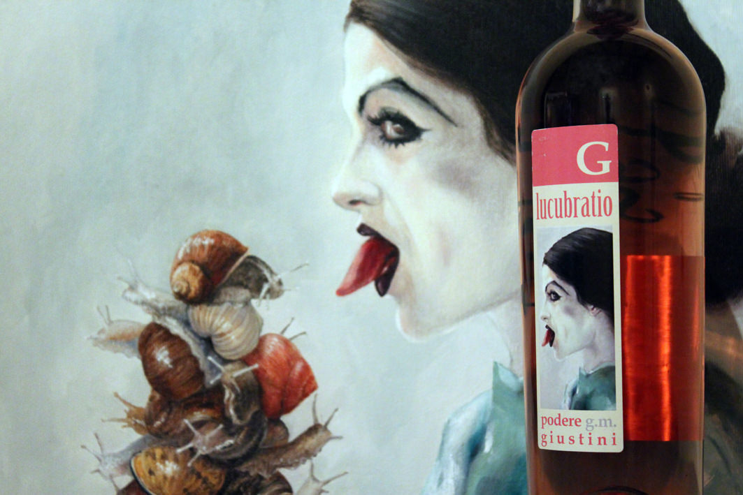 Simona Bramati insieme al vignaiolo Nicola Splendiani dell'Azienda vitivinicola Podere Giustini. coordinati da Giovanna Giannini Guazzugli, presenteranno la nuova linea di vino rosato che ha come nome ed immagine "Lucubratio", l'opera di Bramati in mostra fino al 14 settembre 2014 nella Living Room di Casa Sponge.