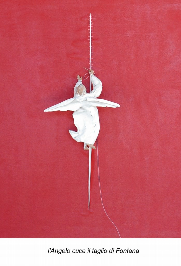 Ma osserviamo almeno alcuni di questi lavori dissacratori e, al tempo stesso, avvincenti: ecco, ad es. l’angelo (ripreso da Lorenzo Lotto) che “fa pipì” nel “Pissoir” di Marchel Duchamp. Un’offesa al grande sovvertitore dell’arte novecentesca? Certamente, no! Perché la scherzosa figurazione non mette certo in dubbio il peso culturale degli objets trouvés duchampiani; ma, in certo senso, lievemente irride a una magnificazione quasi eccessiva d’un artista ben conscio dell’effetto dissacrante del suo “Pissoir”; e che, purtroppo, è stato scimmiottato da tanti epigoni inesperti. Un discorso analogo si può fare a proposito dell’angelo che “rammenda” un taglio di Fontana. Anche qui: non certo derisione per il noto “gesto” del nostro massimo artista dell’ultimo cinquantennio; ma sottile sarcasmo per tutti coloro che, all’apparire dei “tagli” e dei “buchi”, li interpretarono con dei commenti analoghi all’effetto dell’attuale “cucitura”. E altrettanto si può affermare a proposito di altre opere qui presenti come quella dove “Gli angeli annusano la merda di Piero Manzoni”, geniale invenzione dell’artista milanese, sin troppo osannata e mercantilmente valorizzata. Altrettanto accade col pannello della “Annunciazione a Maria”, dove al posto della Vergine l’angelo (ripreso dal Beato Angelico, ) annuncia l’avvento di “Brillo” (dal ben noto lavoro di Warhol).