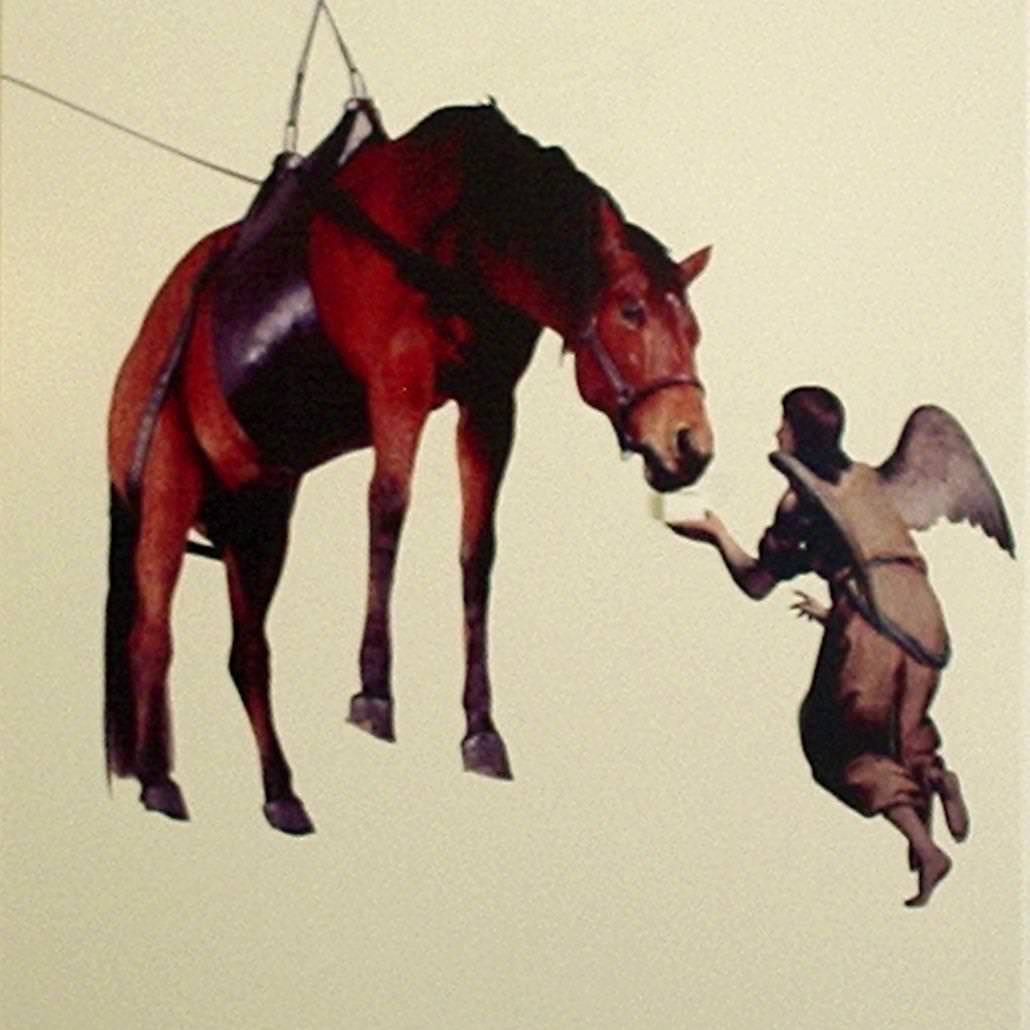Dalla presentazione di Gillo Dorfles al catalogo di questa mostra, ripresa da una installazione del 2005 nel Museo Archeologico di Verucchio: “Se c’è un atteggiamento che differenzia in modo inequivocabile l’uomo dagli animali è proprio l’ironia, la satira, l’umorismo. Non la burla, il dispetto, che allignano anche presso le scimmie; ma saper vedere e agire con ironia, con humor, anche davanti ai grandi eventi della nostra esistenza è certamente un segno di intelligenza e di maturità. Ho sempre pensato che l’ironia e la satira siano tra le più eccelse qualità umane: senza di loro saremmo affogati (o già lo siamo?) in una palude di conformismo e di noia… Un avvicendarsi di figurazioni angeliche – ricavate da illustrazioni celebri del passato : da Lorenzo Lotto a Giotto, da Raffaello a Correggio, da Velázquez al Beato Angelico – e in seguito manipolate e talvolta ridipinte – fungono da “messaggeri” (“angeloi” per l’appunto) di una sottile ma pungente dissacrazione rivolta a noti capolavori dei nostri giorni”.