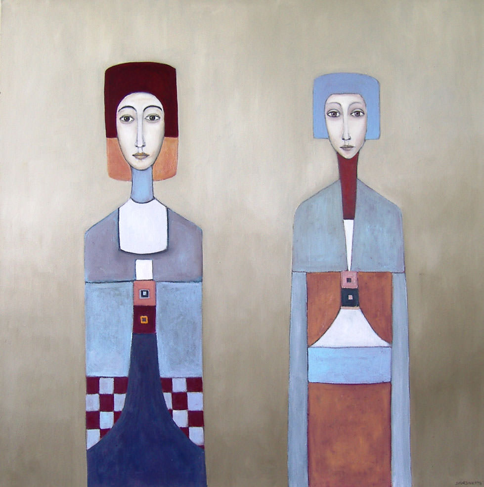I quadri di Simona Stivaletta trasportano l’osservatore in un’atmosfera sospesa, di difficile collocazione spazio-temporale, volutamente scissa da un’unica lettura identificativa. Solo rapidi dettagli agganciano le immagini ad un dato arco di anni piuttosto che ad altri, mentre gli sfondi neutri o nebulosi assorbono lo sguardo in una dimensione musicale, riflessiva, che invita a non dare mai nulla per scontato nella percezione di figure e architetture. Il ritmo di queste note visive è, come dice l’autrice stessa titolando l’esposizione in programma presso la Galleria ArtiBus di Vasto, un Adagio. La lentezza, la calma, la ieraticità caratterizzano persone e animali che si proiettano curiosi verso il mondo di chi li vede per la prima volta ma sembra conoscerli da sempre. Occhi grandi, spalancati, in cerca di dialogo con chi si affaccia oltre i confini della tela, conferiscono all’apparente immobilismo una vivacità capillare ed ingenua. All’adagio, dunque, si fonde un malcelato brio che trasforma narrazioni enigmatiche in possibili stralci di vita. Su tutto campeggia l’attenzione rivolta ad una femminilità fragile ma granitica, pronta a difendersi e a difendere ciò che ama con determinazione.