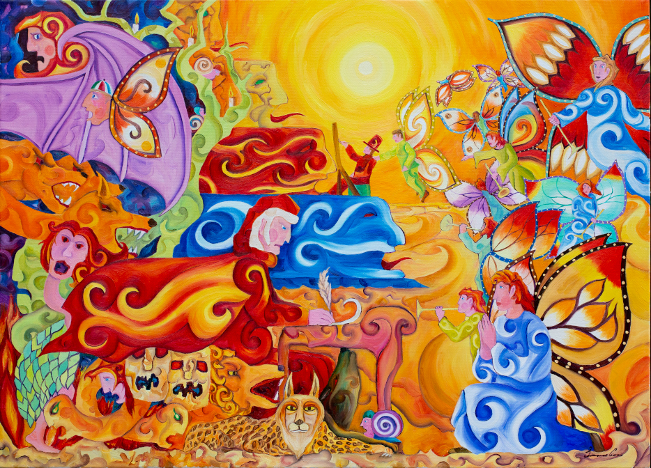 Un punto di vista molto personale sulla Commedia di Dante ricco di colori ed immagini in una visione binaria che mostra la complessità della scena senza tralasciare il dettaglio delle varie situazioni, il tutto con una pittura sobria e molto realistica.