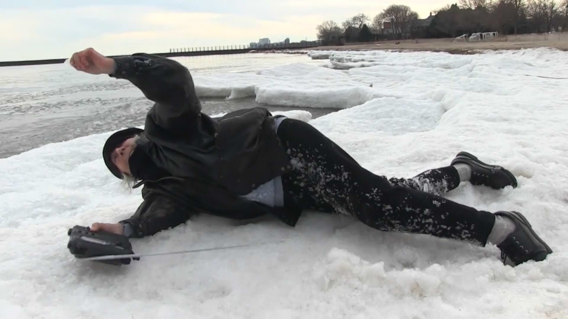 I am happy to be showing recent work, a triptych of related videos. As the center of gravity of the show, “On an Iron Post”, they present an intimately physical engagement with ocean, river and lakefront and with sand, water and snow. Each video somehow refers to the broader world, with a mass of newspapers, with an abstracted flag, and with a little black crank-up radio. There is no intended message, but rather an invitation to let your body have it’s own ideas and thoughts. Simone