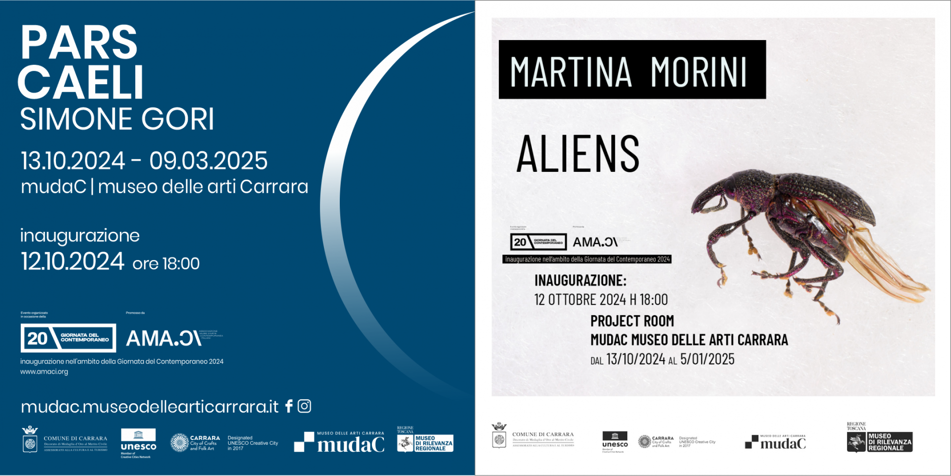 La natura come forma artistica perfetta, celebrata nelle sue mille sfaccettature, è al centro di due mostre promosse dal Comune di Carrara e prodotte dal mudaC │museo delle arti Carrara, nell’ambito della XX edizione della Giornata del Contemporaneo AMACI (Associazione dei Musei d’Arte Contemporanea italiani). Le inaugurazioni di Pars Caeli di Simone Gori (Firenze, 1986) e di Aliens di Martina Morini (Carrara, 1985), si tengono il 12 ottobre 2024.