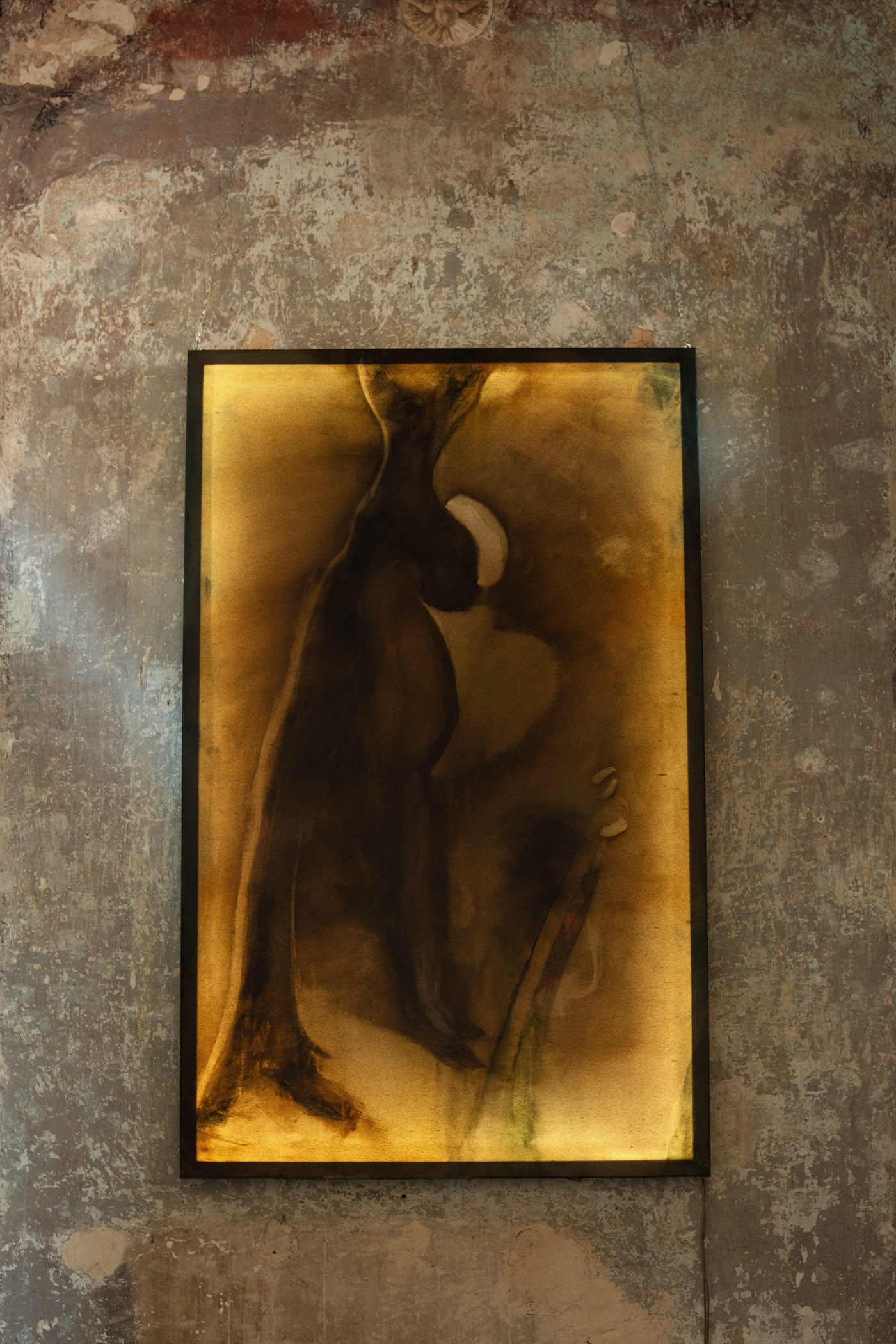 Il titolo 'corpo di immagini' indica un insieme organico di opere concepite come presenze vive, capaci di dialogare tra loro e con lo spazio. Ogni tela non è solo rappresentazione, ma soglia: un punto di passaggio tra memoria, mito e esperienza sensibile, dove pittura e architettura si fondono in un unico organismo. Installate in grandi light-box retroilluminati, che evocano le vetrate di una cattedrale gotica, le immagini trasformano lo spazio in un ambiente immersivo. Il percorso del visitatore diventa un rito laico, che attraversa memoria e mito, pittura e architettura, luce e ombra. Ogni opera è una soglia, ogni installazione un respiro che unisce corpo, mito e spazio.