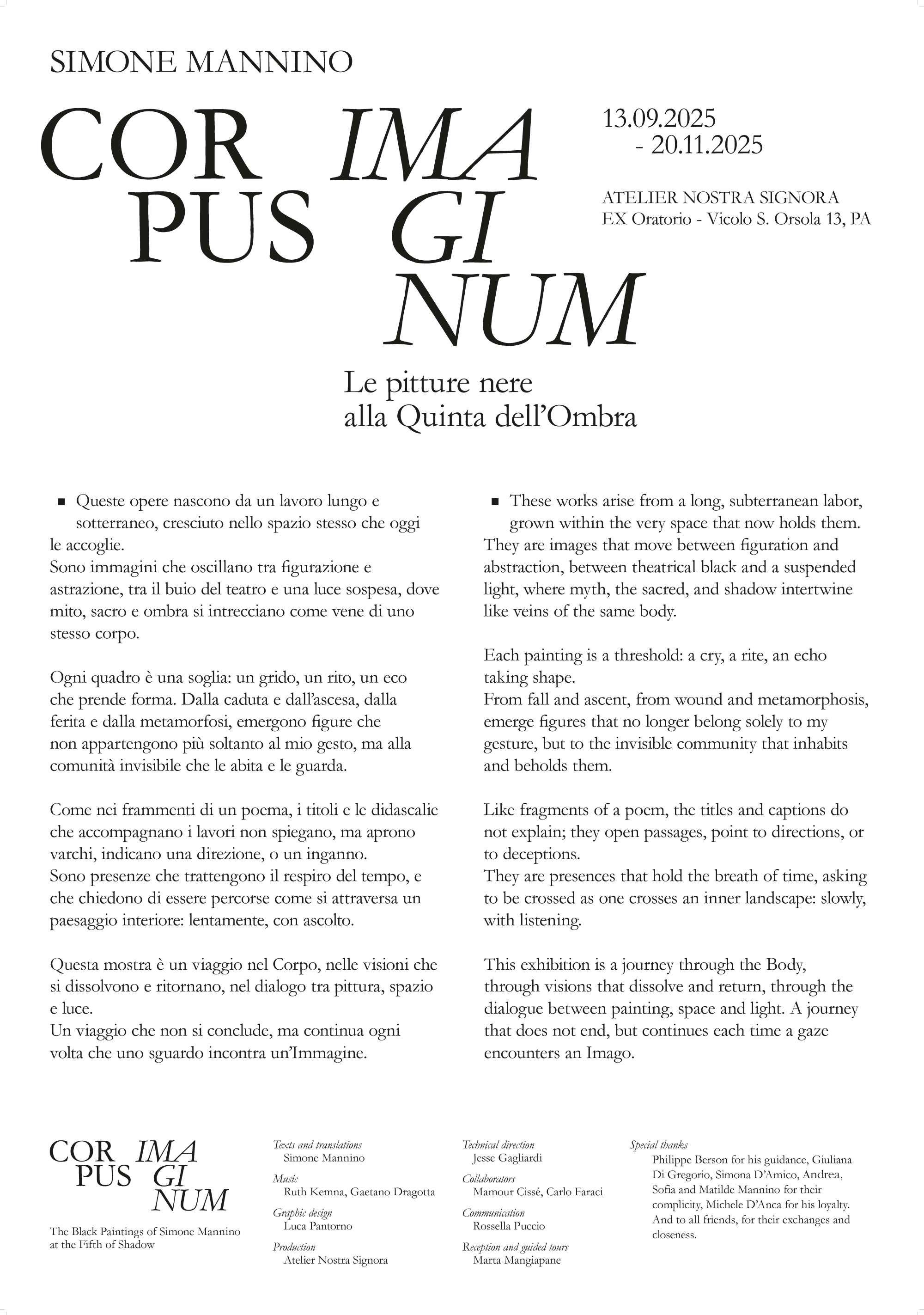 Palermo inaugura un nuovo centro di produzione e ricerca artistica internazionale con la mostra personale di Simone Mannino, 'CORPUS IMAGINUM – Le Pitture Nere alla Quinta dell’Ombra', pitture e disegni inediti di grande formato che danno vita a un viaggio potente e denso nella pittura come atto spirituale e mitologico. L’antico ex oratorio della chiesa sconsacrata in Vicolo Sant’Orsola 13, dopo anni di abbandono e importanti interventi di recupero, viene restituita alla città come fucina di arte contemporanea. Dopo una prima apertura parziale a cantiere aperto nel 2019, lo spazio ritorna oggi definitivamente a vivere come luogo di produzione, incontro e trasformazione.