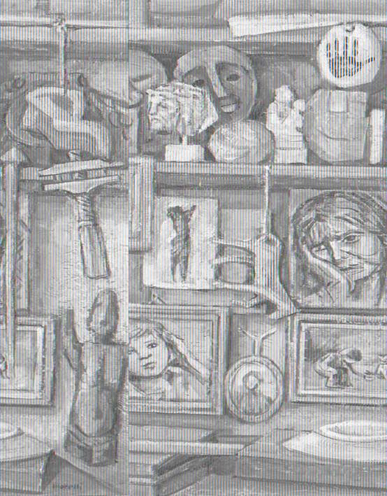 E’ questo il teatro di un quotidiano corpo a corpo per piegare alle proprie intenzioni poetiche i più disparati materiali artistici: la terra della sabbia e delle colle delle tavole dipinte, le pietre, i sassi, i cementi, l’aria delle velature dei colori acrilici, l’anilina dei ricalchi d’immagini, i liquidi inchiostri dei disegni, matite, carboncini, pastelli a cera, supporti dalla più varia, e non convenzionale provenienza come fogli di riviste, carte da parati, ritagli di calendari, campioni di tappezzerie, cartoni di recupero, frammenti di pubblicità.