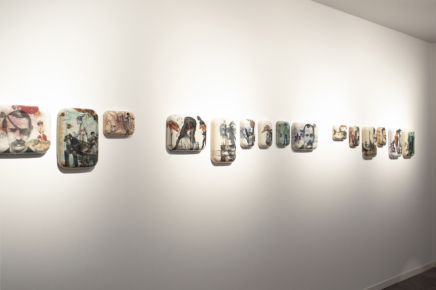 Di Fabio Taramasco una ventina di Formelle (eseguite con la tecnica della fotoceramica) qui l’ispirazione è da ricercarsi nei rebus e nelle carte didattiche che si usano con i ragazzi, a seconda di come queste immagini vengono accostate si possono leggere storie di volta in volta differenti, come anche creare le nostre…