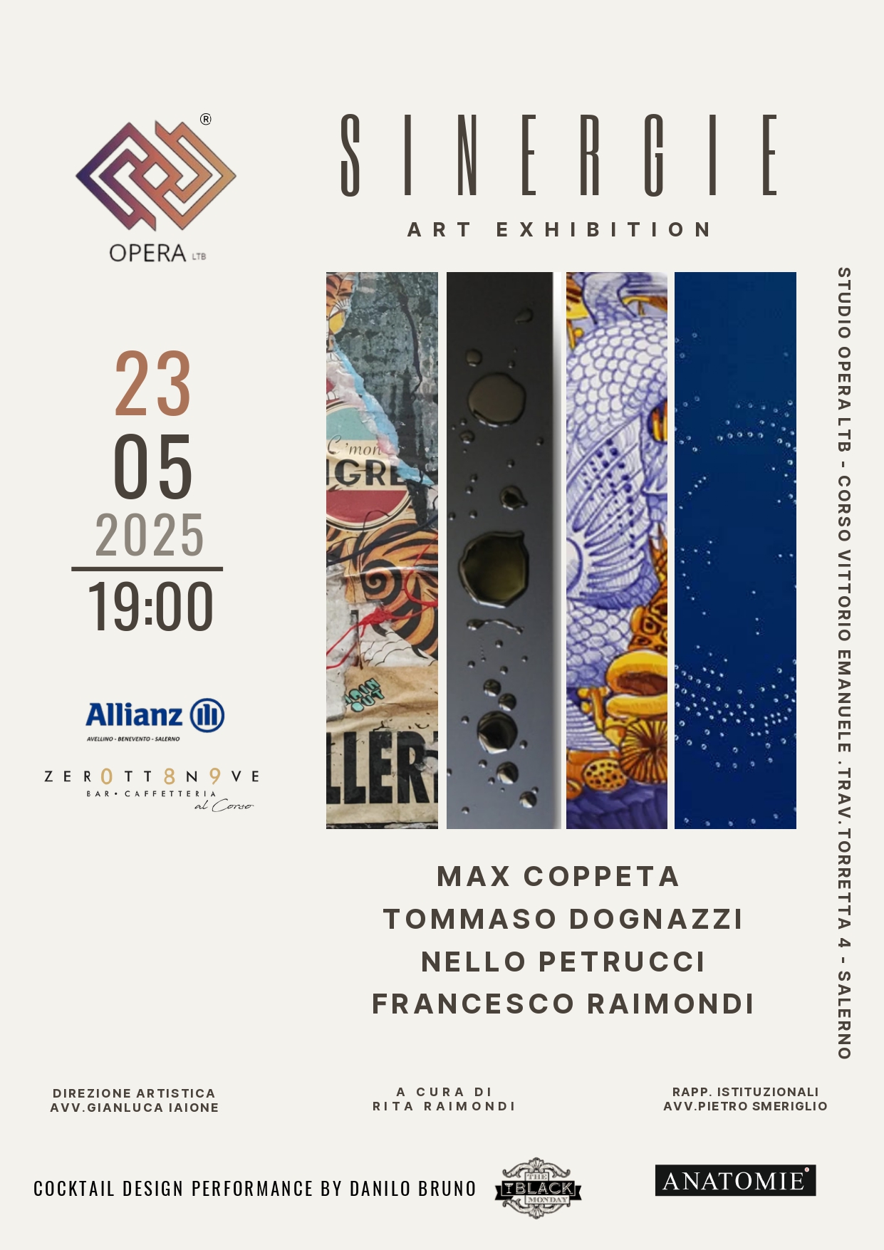 L’esposizione collettiva Sinergie, nell’ambito della Salerno Design Week 2025, apre le porte al pubblico il 23 maggio alle ore 19:00 presso Opera Studio Gallery, con le opere di 4 maestri dell’arte contemporanea: Max Coppeta, Tommaso Dognazzi, Nello Petrucci e Francesco Raimondi.