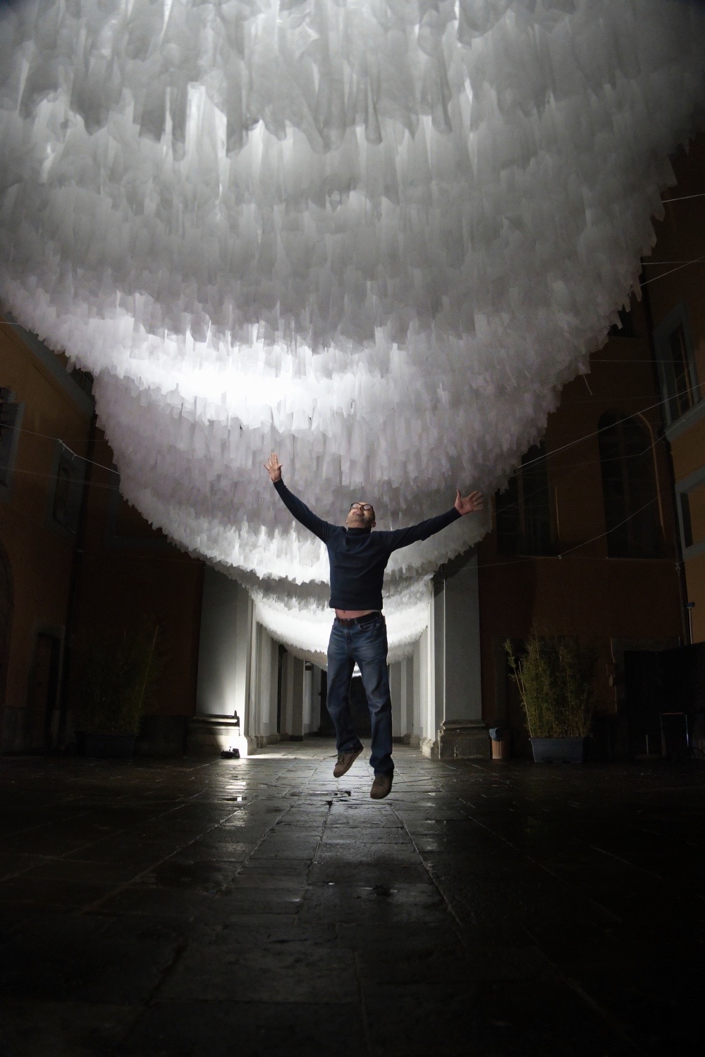 All’interno di Palazzo Gualterio 30000 teli sospesi fluttuano creando un atmosfera eterea e soffusa tra luce ed ombra