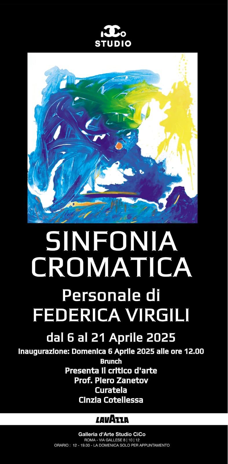 La Galleria Studio CiCo è lieta di presentare SINFONIA CROMATICA, la mostra personale dell'artista Federica Virgili, che verrà inaugurata domenica 6 aprile alle ore 12:00 presso la sede della galleria in via Gallese 8, a Roma.