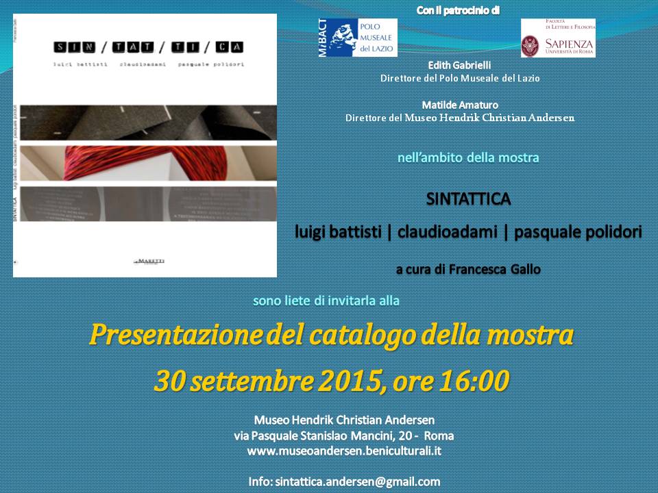 Il Polo Museale del Lazio, diretto da Edith Gabrielli, prosegue nella sede del Museo Andersen, diretto da Matilde Amaturo, le attività collaterali della mostra Sintattica. Luigi Battisti / claudioadami / Pasquale Polidori, a cura di Francesca Gallo.