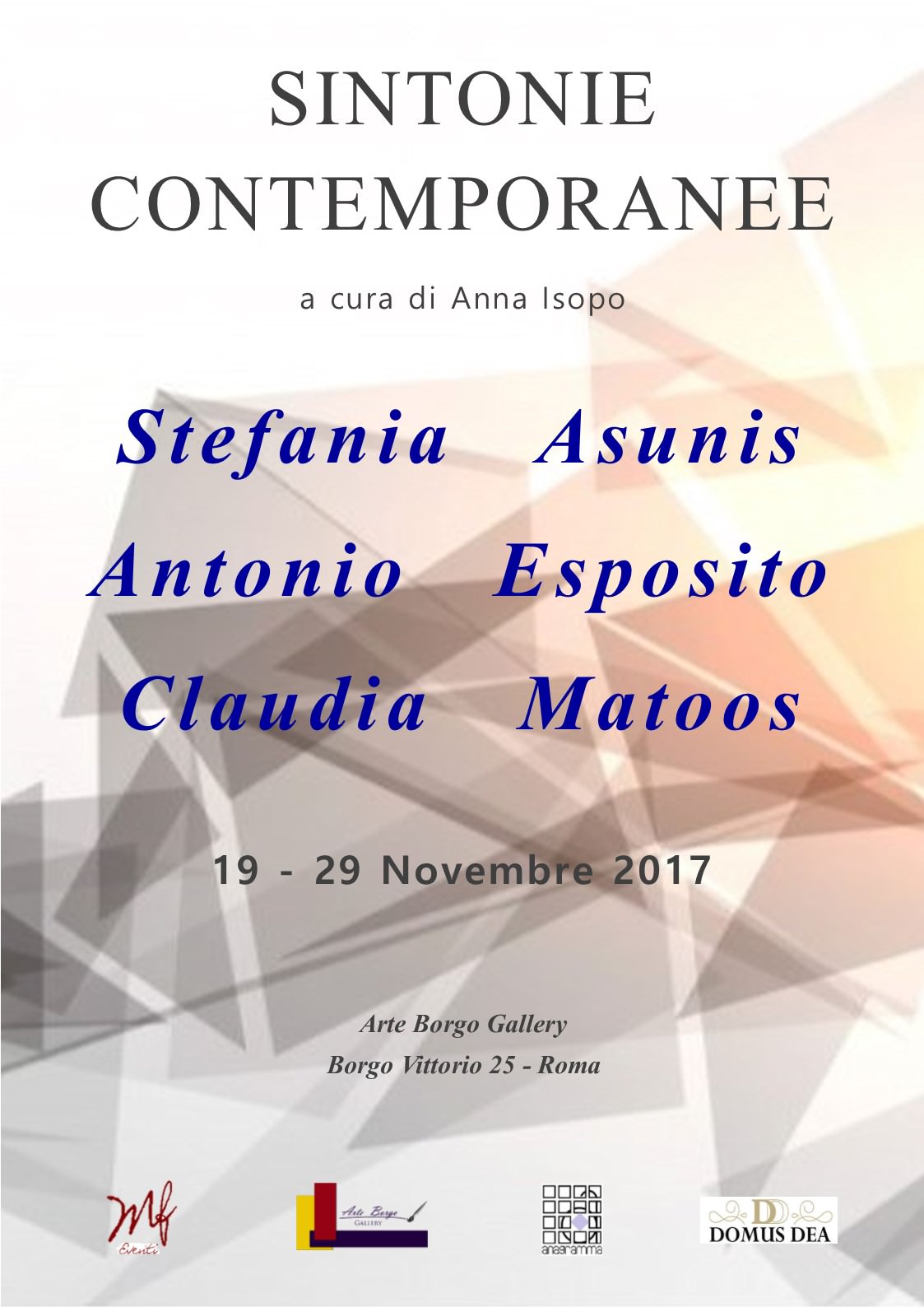 Domenica 19 Novembre alle ore 17,30 nello spazio espositivo di Arte Borgo Gallery in Borgo Vittorio 25 Roma verrà inaugurata la mostra tripersonale di Stefania Asunis, Antonio Esposito, Claudia Matoos.