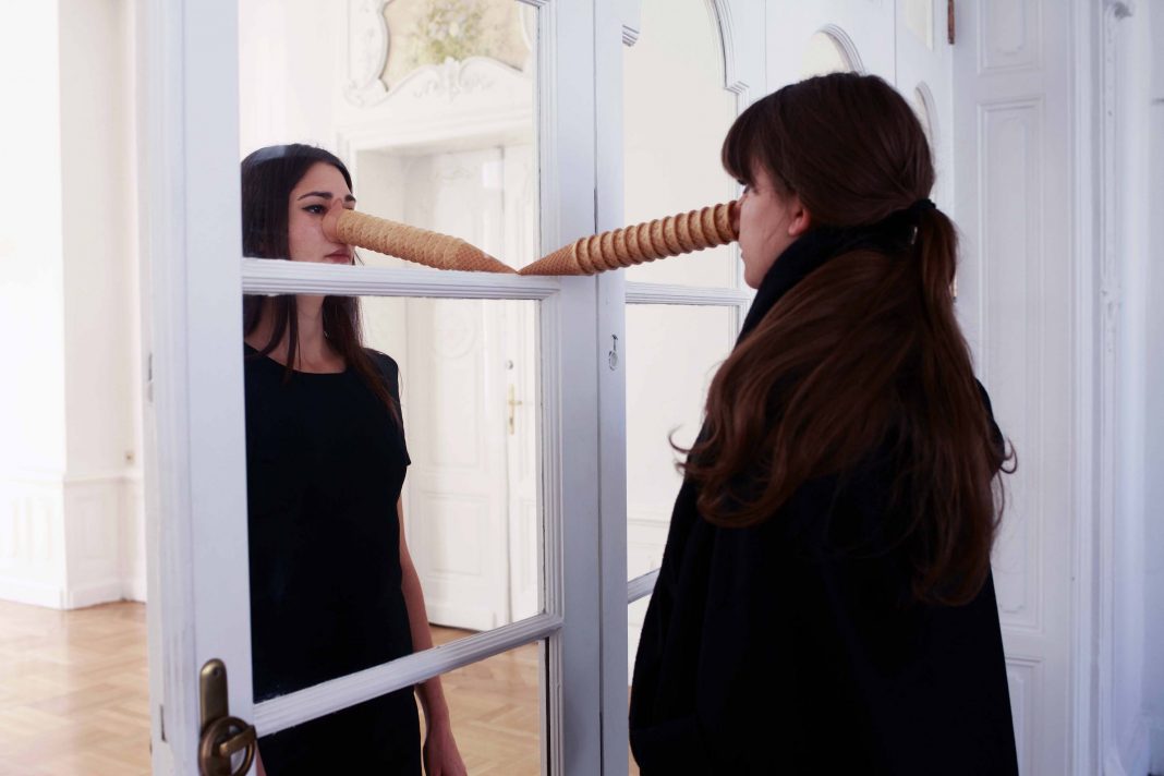 Ma il comportamento delle donne cela dunque un’inazione costrittiva, o piuttosto la nonchalance di una deliberata scelta di negazione di sé? L’elemento più decisivo e straniante, che sembra forzare tutte le azioni delle protagoniste video in un’assurda forzatura, è dato dall’elemento fittizio dei nasi, composti per sovrapposizioni di coni-gelato vuoti. Come dei tentacoli, o degli arti aggiuntivi e limitanti, i nasi di coni limitano la percezione delle donne e i loro movimenti, sino a diventare il fulcro visivo della scena e manifestarsi come strumenti di offesa, lance che collassano tra di loro nel climax finale attorno a un tavolo. È questo il momento in cui si infrange l’incantesimo e si svincola la volontà, lasciando alle protagoniste spazio e libertà di abbandonare il chiuso del palazzo e conoscere finalmente sé stesse.