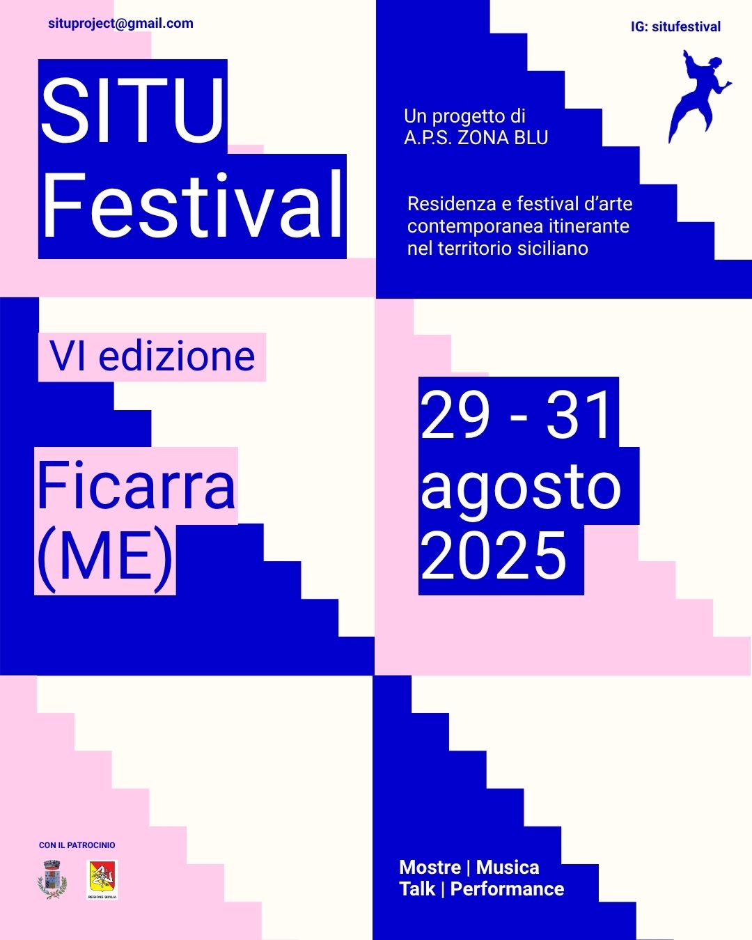 L’obiettivo del festival è quello di attivare un dialogo tra artisti, territori e abitanti, stimolando pratiche culturali inclusive e processi di rigenerazione collettiva nei borghi dell’entroterra siciliano. Ogni anno, il festival si articola in due momenti distinti: una prima fase dedicata alla residenza artistica (18 – 28 agosto), durante la quale gli artisti selezionati tramite open call vivono e lavorano nel territorio per realizzare opere site-specific in dialogo con il contesto sociale, storico e architettonico; e una seconda fase, quella del festival pubblico (29–31 agosto), che prevede la restituzione del lavoro svolto alla comunità con l’apertura delle mostre, performance, talk, tour guidati, laboratori e momenti musicali. Gli artisti in residenza quest’anno sono Alessia Talò, Camila Curiel, Margot Kalach, Rosa Frazzica & Gregorio Vignola, Rossana La Verde, Montesano Vittoria & Lorenzo Finotti, Silvia Muscolino, che lavoreranno direttamente negli spazi espositivi trasformati in studi temporanei per un dialogo immersivo con il luogo. Accanto a loro, il festival ospiterà interventi speciali degli artisti Diego Miguel Mirabella, Alfredo Pirri, Luca Vitone e Massimo Bartolini. Il percorso espositivo coinvolge numerosi spazi simbolici del borgo e si inserisce nel Museo Diffuso di Ficarra e nel progetto La Stanza della Seta, attivato dall’artista e attuale delegato alla cultura di Ficarra Mauro Cappotto, toccando luoghi come Palazzo Milio, Convento dei Cento Archi, Fortezza Carceraria, Palazzo Ferraloro, Museo della Ceramica, Palazzo Busacca, Chiesa di San Marco e diverse vetrine diffuse nel centro storico. Il festival è realizzato con il sostegno del Comune di Ficarra, Unione dei Comuni Terra dei Lancia, Regione Sicilia, in collaborazione con Fondazione Oelle, Fondazione Brodbeck, Fondazione Riv, Pulcherrima Res, La Stanza della Seta. Oltre alle mostre, SITU Festival propone una ricca programmazione gratuita tra cui talk pomeridiani presso Palazzo Milio con la partecipazione del curatore Mario Bronzino, delle fondazioni partner, del collettivo transnazionale Studio Rizoma e degli artisti ospiti. La programmazione notturna ospitata nel Convento dei Cento Archi, prevede performance sonore e dj set con la partecipazione del trio composto da Sam Zanardo, Sara Firrarello e Vittorio Auteri, del collettivo TRDE, Mac Tire, Oleksandr Stoliarov, Sumbakkos e Ice Granita, per la serata di chiusura, ospiterà la food performance di Aterraterra (Fabio Aranzulla e Luca Cinquemani). Tutti i giorni, a partire dalle 18:00, saranno organizzati tour guidati con i curatori e gli artisti della sesta edizione presso gli spazi espositivi. A precedere la programmazione pubblica della sesta edizione, SITU Festival presenta un appuntamento speciale Fuori Festival con un ospite d’eccezione: l’artista Luca Vitone, che venerdì 23 agosto alle ore 20:30 presso Palazzo Milio presenterà in esclusiva il suo nuovo progetto Pro tempore, vincitore dell’Italian Council 2025 e seguirà la proiezione del film Romanistan (2019), un viaggio sulle tracce delle origini del popolo rom. Un evento che anticipa le giornate ufficiali del festival, aprendo una riflessione sul tema del viaggio, dell’identità e della memoria, nel cuore del borgo siciliano. SITU Festival è anche un’esperienza formativa: ogni anno, in collaborazione con l’Accademia di Belle Arti di Catania, il progetto accoglie tirocinanti che prendono parte attivamente alla produzione, vivendo un’esperienza immersiva a stretto contatto con artisti, curatori e operatori culturali. Il festival si propone così come una piattaforma di crescita condivisa, capace di attivare sinergie con il territorio e generare nuove connessioni culturali. Il team della sesta edizione è composto da Nicola Tineo, Viola Lo Monaco e Francesca De Chiara. Si ringrazia per il supporto: Pistì, Lenzo Winery, Plastitalia, Quarter e Dueerre printing.