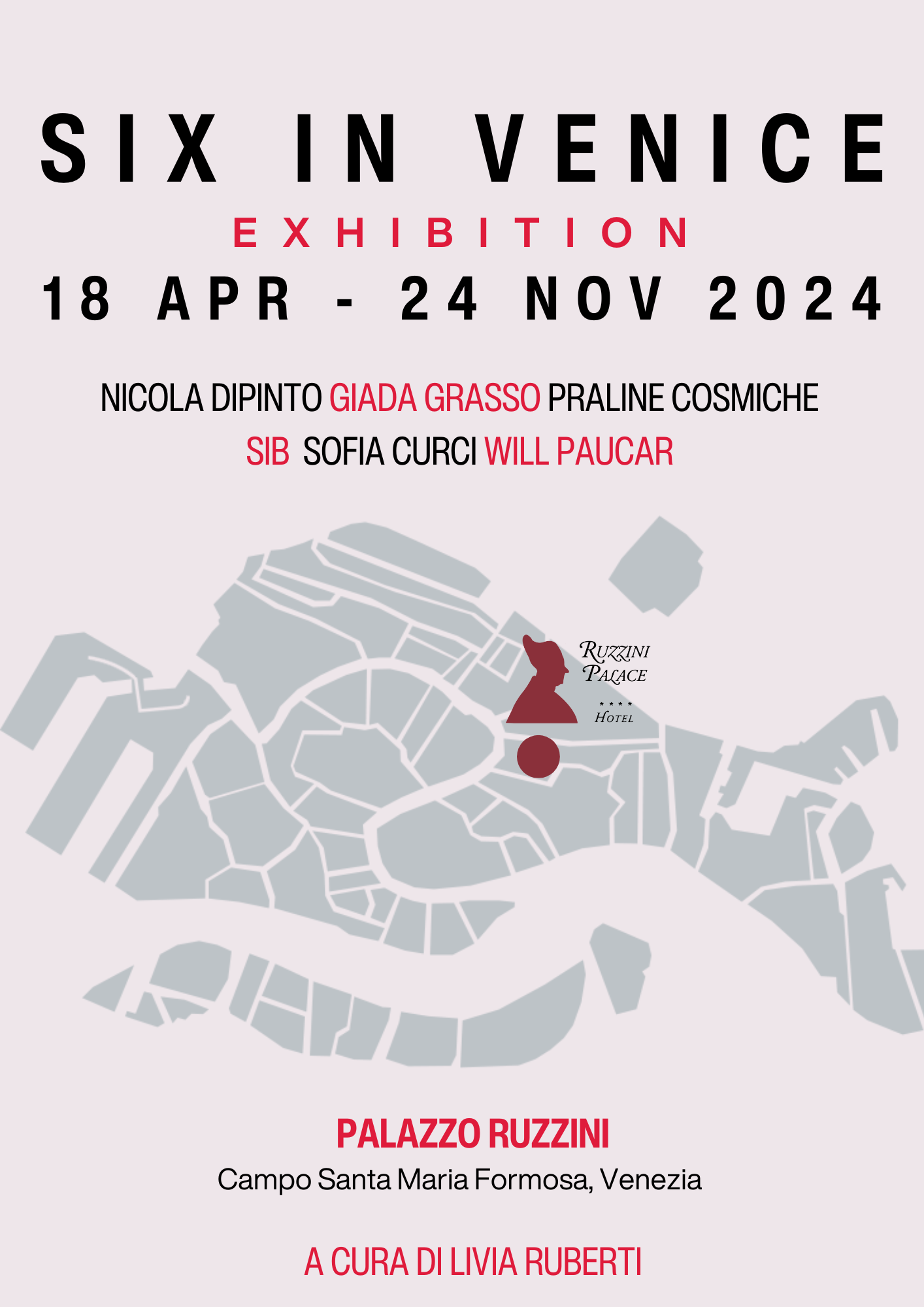 La mostra SIX in Venice, a cura di Livia Ruberti, a Palazzo Ruzzini a Venezia dal 18 aprile al 24 novembre 2024, indaga nuove prospettive della ricerca artistica ed estetica dell’individualità attraverso le opere di Giada Grasso, SIB, Nicola Dipinto, Praline Cosmiche, Sofia Curci e Will Paucar.
