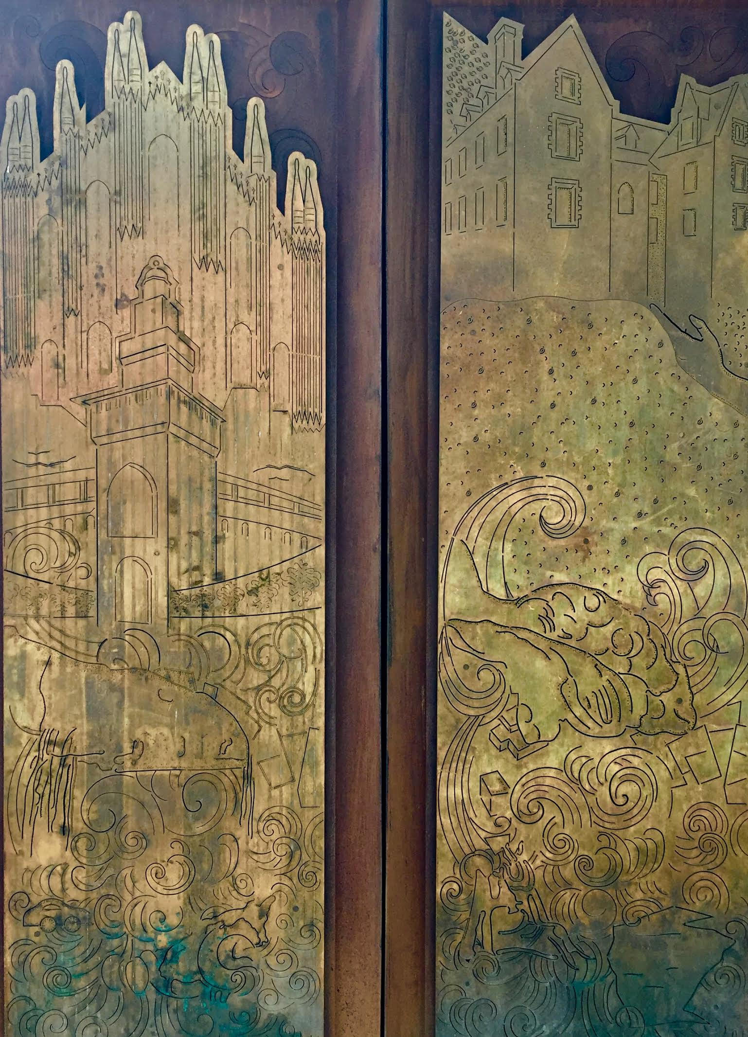 Come gli Skyline presenti in incisione su ottone nella Piazza Carlo Pedretti, le opere rappresentano i luoghi che hanno accompagnato il percorso di vita di Leonardo: Vinci, Firenze, Milano, Roma ed Amboise.