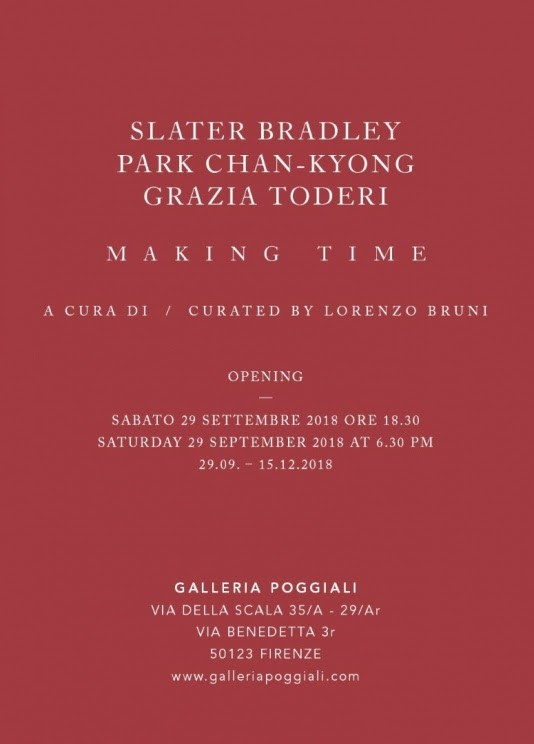 Sabato 29 settembre 2018 alle ore 18,30, la Galleria Poggiali inaugura nella sede di Firenze (Via della Scala, 35/a e Via Benedetta, 3r) la mostra Making Time a cura di Lorenzo Bruni, costituita da opere di tre artisti internazionali: Slater Bradley (San Francisco, 1975), Park Chan-kyong (Seul, 1965) e Grazia Toderi (Padova, 1963). Il progetto propone tre mostre autonome di artisti di fama mondiale, ciascuna costituita e caratterizzata da “media” eterogenei che, in anteprima assoluta, presenta al pubblico europeo le ultime produzioni assieme ad opere storiche usualmente non fruibili nei musei italiani, sviluppate nei tre differenti ambienti della galleria fiorentina ed appositamente pensate per questa.
