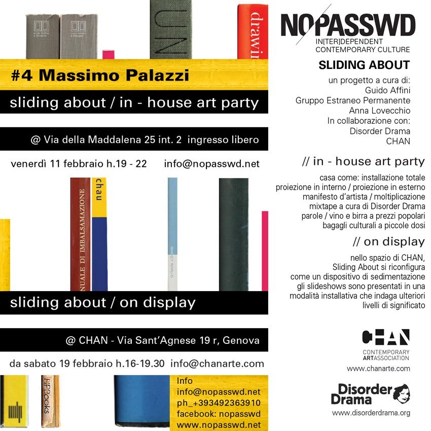Sliding About è: condivisione di percorsi di ricerca personali e background culturali, proposizioni artistiche e prospettive critiche. Un gioco[necessario]: incursione del pubblico nel privato e del personale nel visuale. Gli artisti compongo slideshow di immagini e testi attraverso i quali accettano la sfida di raccontare, creando un linguaggio provvisorio [formulato da opere di artisti storici, citazioni, …] , le proprie origini culturali, il proprio percorso personale ed artistico. Il progetto si articola in due diversi momenti: /in-house art party e /on display.