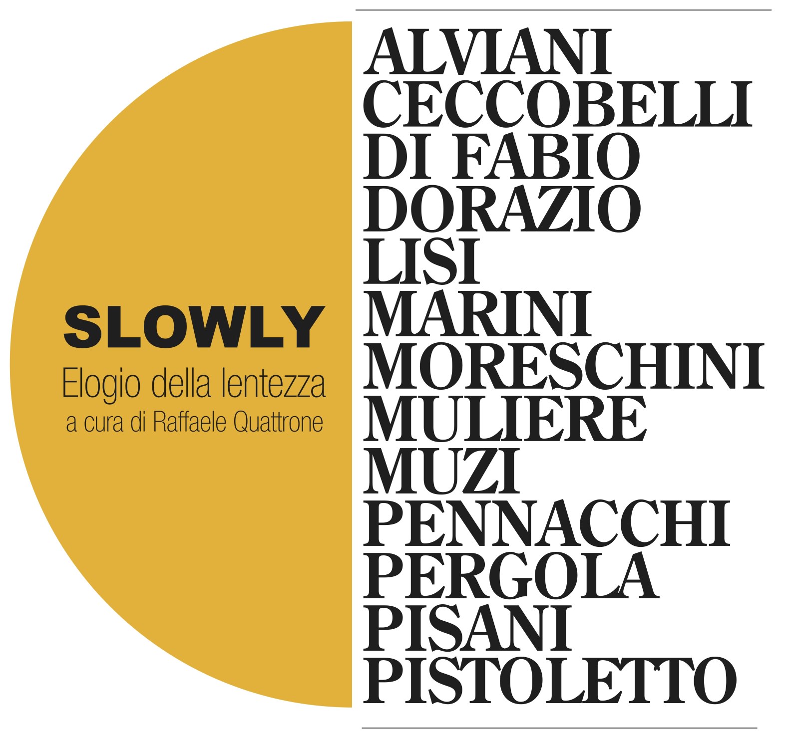In Slowly. Elogio della lentezza, il curatore Raffaele Quattrone torna su alcuni temi caratterizzanti la propria ricerca come per esempio l’arte intesa come via d’uscita da un mondo burocratico ed economizzato, il rapporto etica/estetica, la valorizzazione della cultura umanistica.