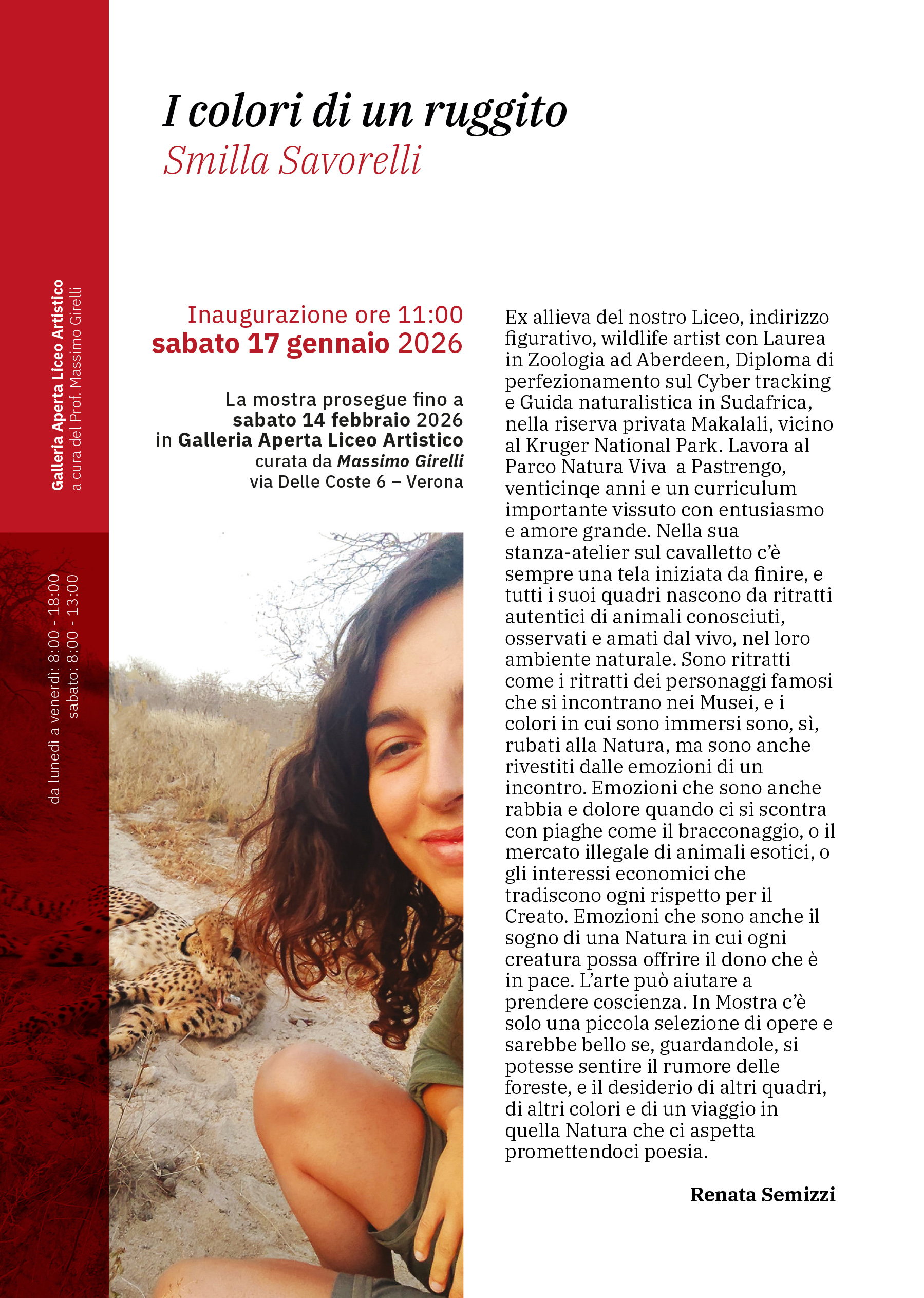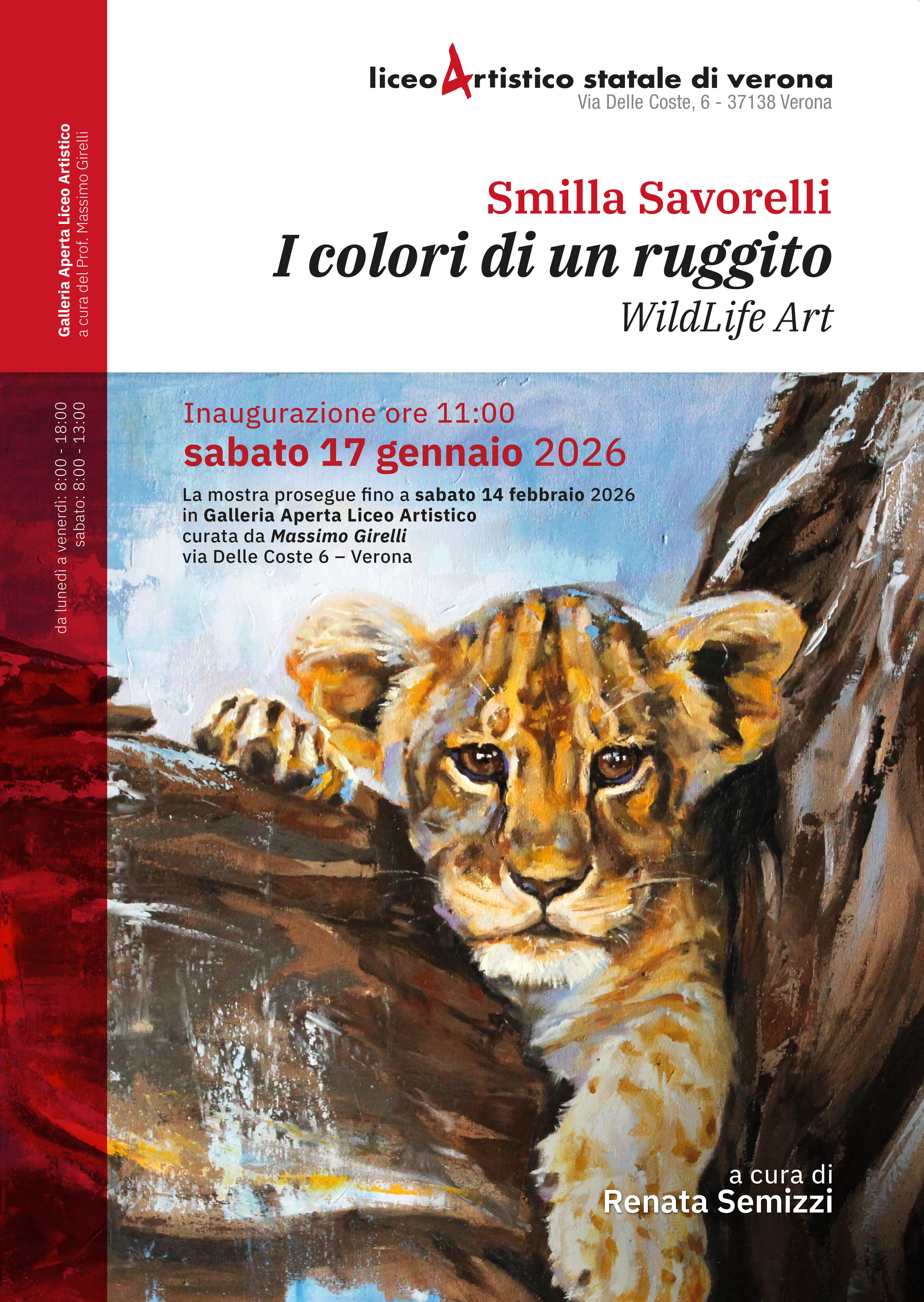 Dal 17 gennaio al 14 febbraio 2026, la Galleria Aperta del Liceo Artistico Statale di Verona ospita I colori di un ruggito – WildLife Art, mostra personale di Smilla Savorelli, artista ed ex allieva dell’indirizzo Arti Figurative dell’istituto. L’inaugurazione è prevista per sabato 17 gennaio 2026 alle ore 11:00.