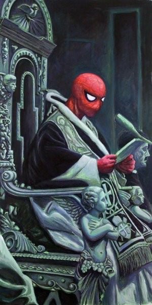 Eppure, malgrado ciò (ma forse proprio per questo), queste opere “sono cecchini (sniper) che ti colpiscono dalla loro postazione nascosta”. Fred Astair che balla davanti alla Torri Gemelle fumanti, la famiglia Roosevelt tramutata in una specie di anaconda, una geisha giapponese che urla all’apparizione di Spiderman sullo sfondo composito di giornali arabi, e poi ancora il Fuhrer, l’arcobaleno della pace, i colori del movimento omosessuale, berretti da giullare, la testa mozzata di San Giovanni Battista, divise militari e decorazioni, la tela dell’uomo ragno, i visi rivisitati dei “pazzi” di Géricault: il mondo Sniper muove simboli potenti, li usa anzi come pallottole, rappresentandoli attraverso una tecnica pittorica rigorosa su tele di grandi dimensioni.