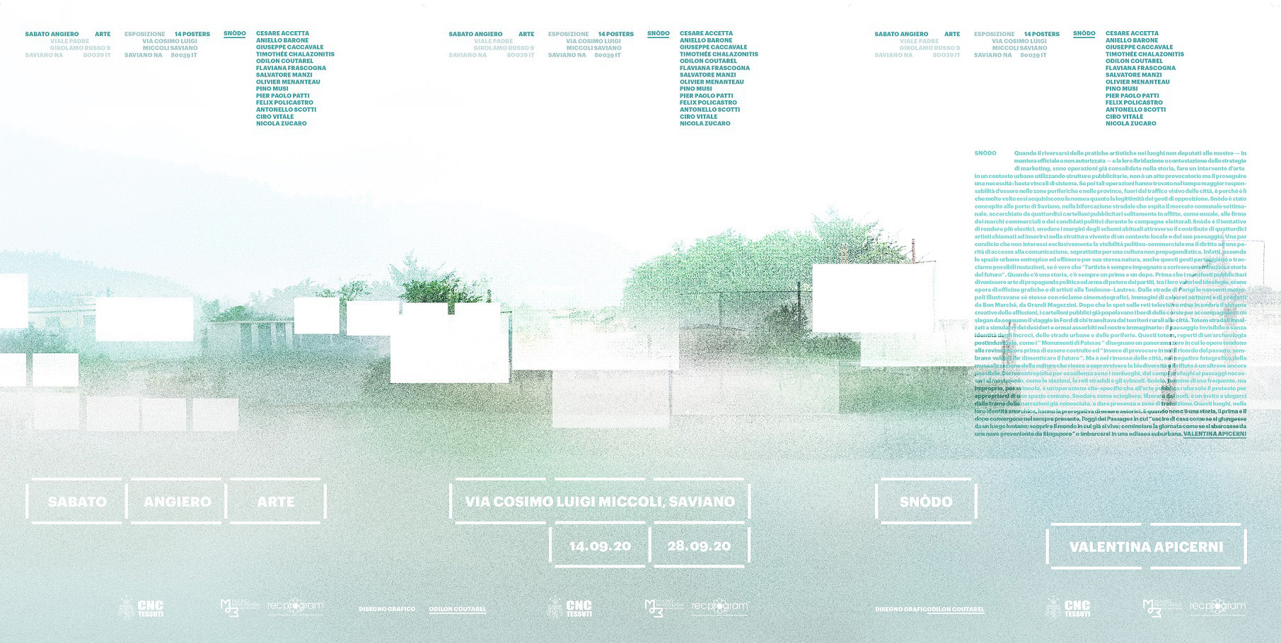Con Snòdo, questi cartelloni pubblicitari ospiteranno i contributi di quattordici artisti internazionali che sono stati invitati a relazionarsi con un tessuto urbano – sempre unico ma identico agli altri come tutte le periferie - e un panorama zero – sempre anonimo ma denso di identità come tutti i luoghi di transizione e di confine.