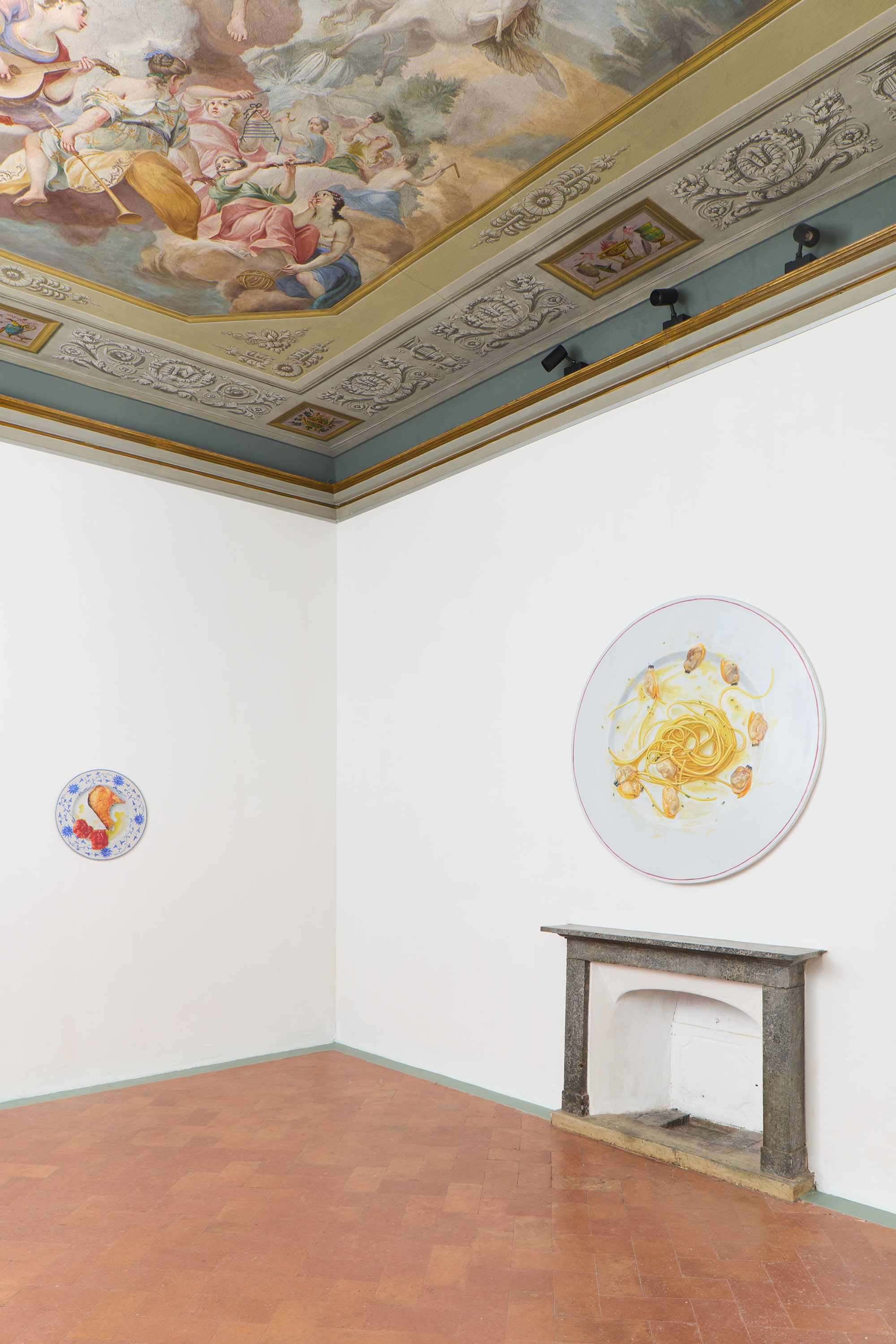 Ci troviamo di fronte ad una tavola imbandita, reduce da una serata le cui tracce sono visibili nei bicchieri di vino più vuoti che pieni, un posacenere stracolmo e tutto quello che popola il campo di battaglia allegra che chiamiamo ‘cena estiva tra amici in Italia’. Tutto, tranne i piatti e vassoi, sostituiti nottetempo da riproduzioni iperrealistiche, olio su tele a forme ovali e tonde, in scala 1 a 1 con le prelibatezze originali. Le troviamo allestite alle pareti, assieme ad altre tavole che immortalano