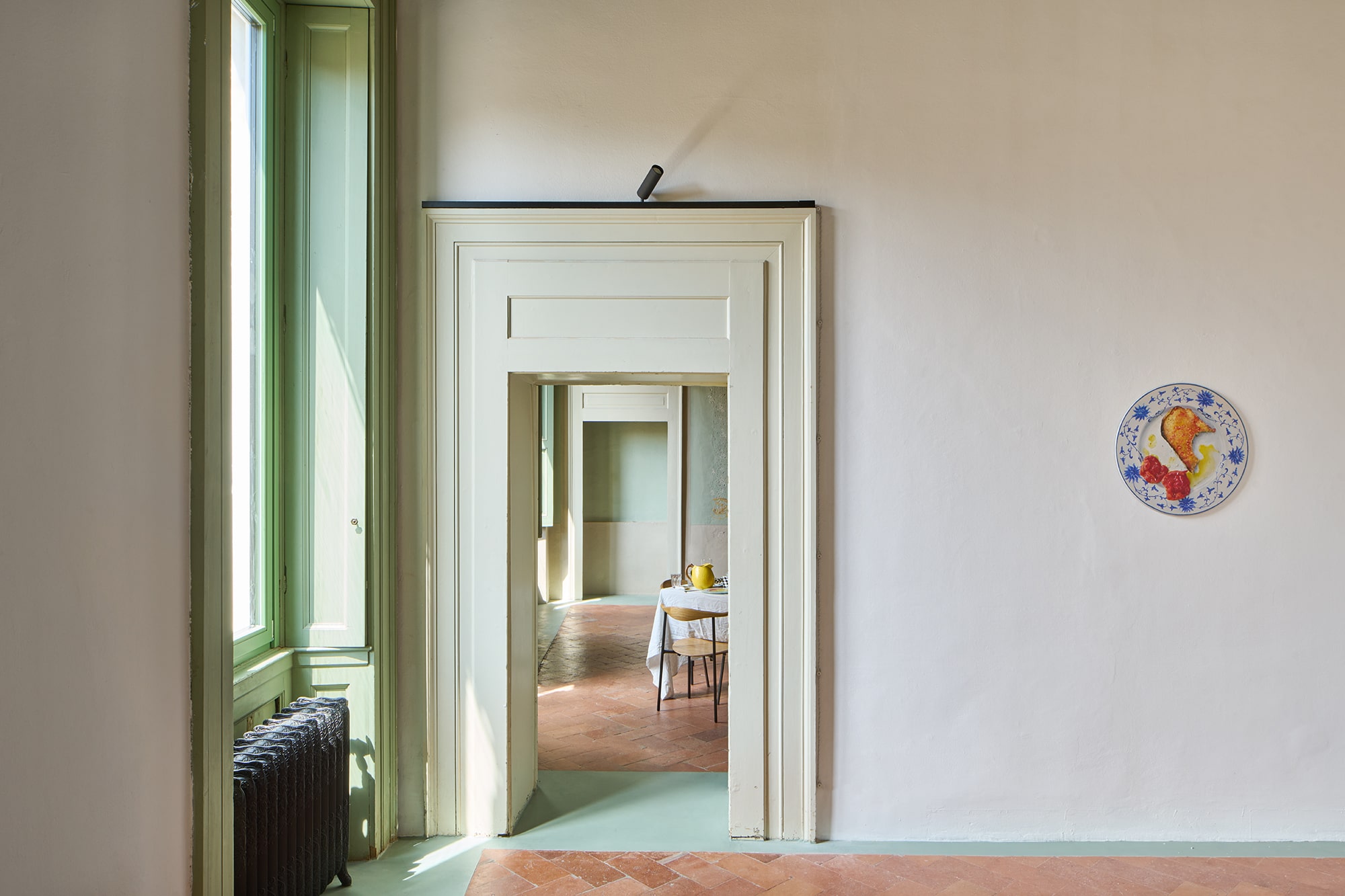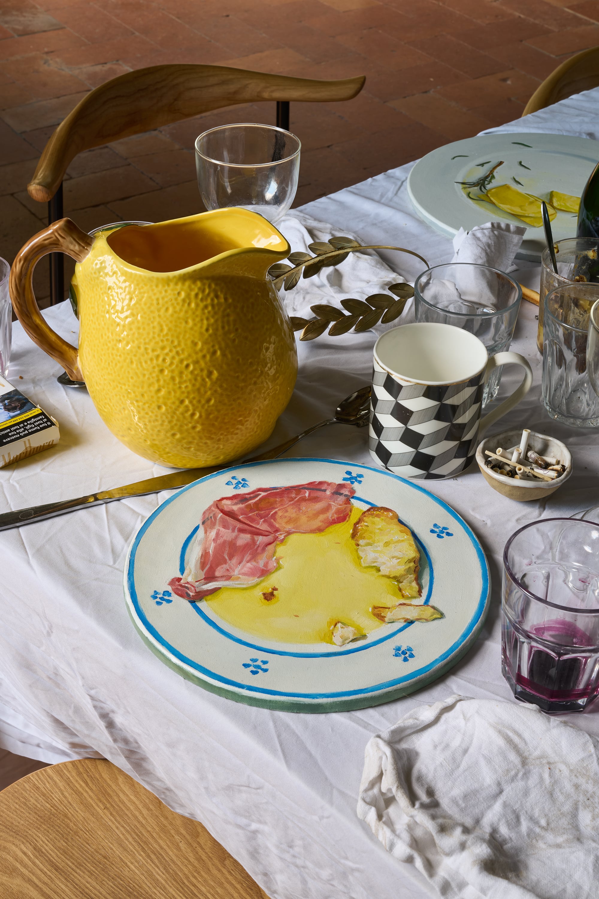 L’effetto a trompe-l’oeil cela un dettaglio autobiografico. L’atto del pranzare in compagnia è diventato l’asse principale della sua vita a Roma, il fulcro della sua comunità di amici e creativi. In una città così ricca d’arte, è stato essenziale aver sviluppato dei ricordi strettamente legati al gusto e all’olfatto. Questi piatti sporchi dipinti seguono alla perfezione la tradizione del trompe-l’oeil, soprattutto quelli che si trovano a Roma: rendono profondo il superficiale, eterno l’effimero.