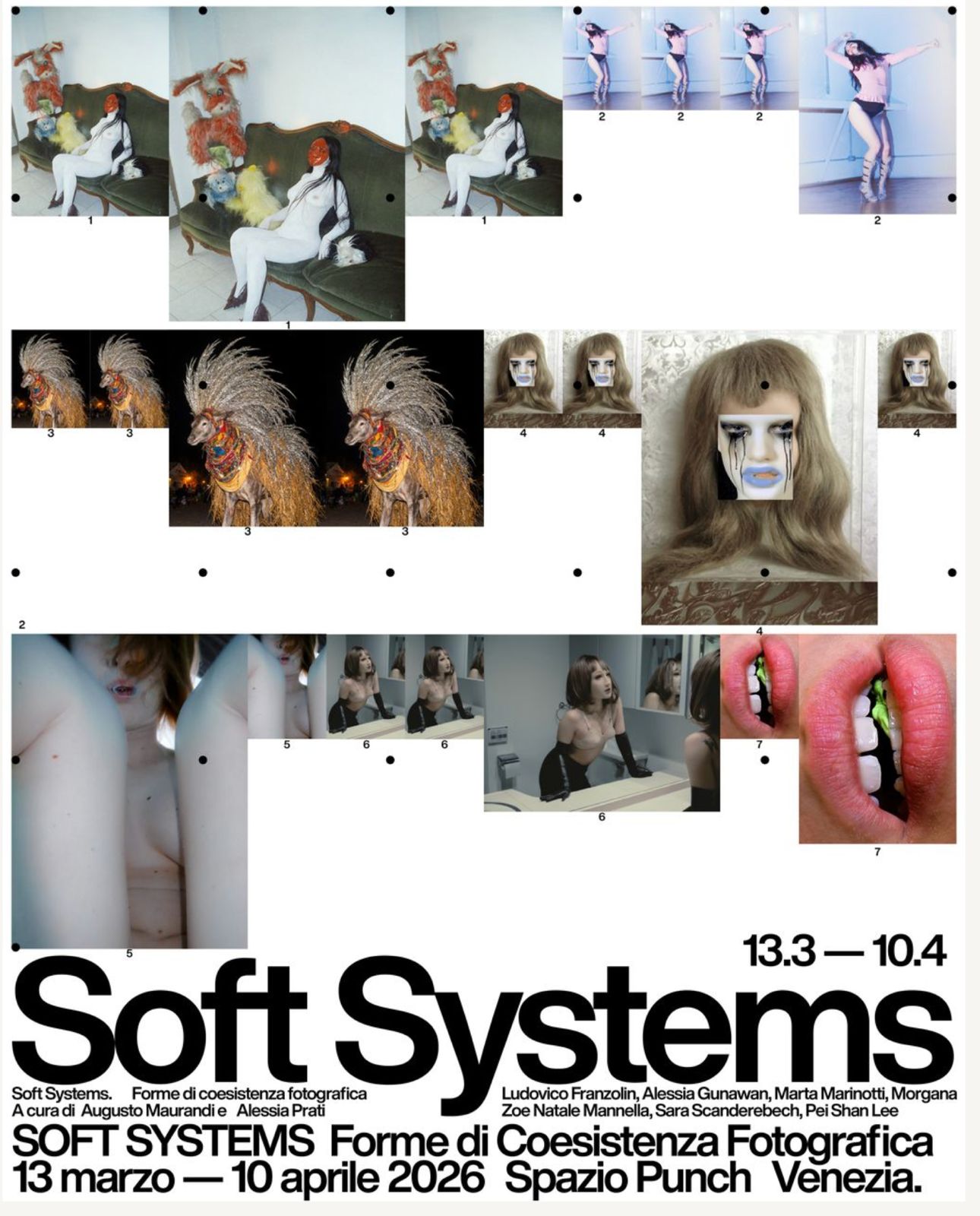 Soft Systems. Forme di coesistenza fotografica si innesta su questa tensione e la articola attraverso un dialogo tra lɜ artistɜ invitatɜ. Gli immaginari e le narrazioni visive di Ludovico Franzolini, Alessia Gunawan, Marta Marinotti, Morgana, Zoe Natale Mannella, Sara Scanderebech, Pei Shan Lee aprono a sistemi morbidi e strutture porose, attraversati da presenze eterogenee, traiettorie culturali e geografie in movimento. Appartenenze plurali, spostamenti transnazionali e contaminazioni estetiche informano le pratiche, facendo dell’immagine uno spazio in cui si sedimentano traduzioni e negoziazioni identitarie. Più che oggetti stabili, le opere sono processi; più che forme concluse, configurazioni temporanee che prendono consistenza nell’incontro, prima con le professionalità coinvolte e con le soggettività fotografate – umane e non –, poi con il pubblico.