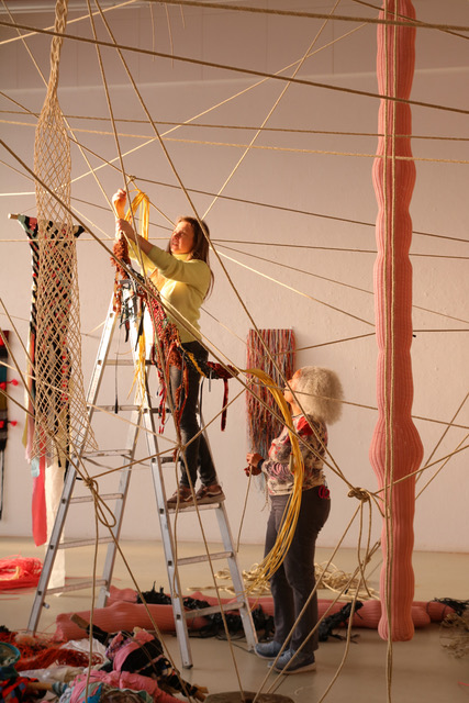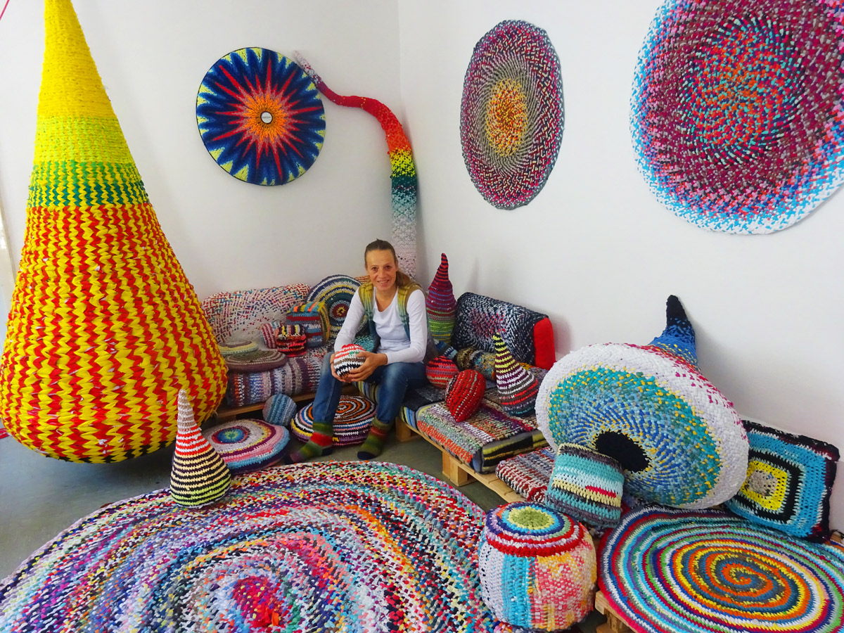 Sculture create con abiti usati, tagliati ed intrecciati secondo antiche tecniche che il progetto Joy of weaving di Doro Seror impara e propone da e in diverse parti del mondo. Un’installazione interattiva in cui ognuno puo’ partecipare all’opera di riciclo. Una concreta riflessione sostenibile.