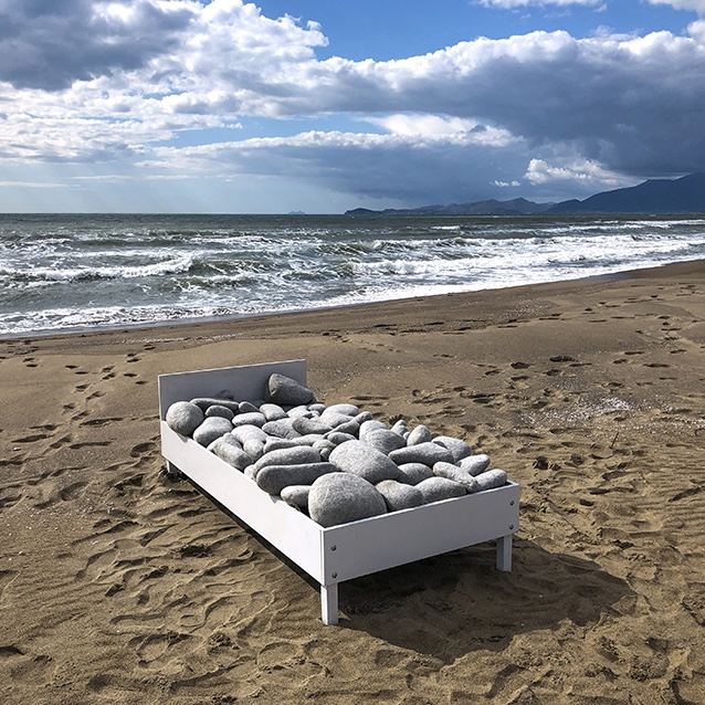 Il lavoro dell’artista Giovanni Odierna nasce da un’idea forte di coerenza artistica tra estetica, forma e materia, componenti che fondendosi fanno si che lo sguardo e la riflessione del fruitore non si disperda mai. La sua attività si articola intorno a tre tematiche principali: il contrasto, il primordiale e il coinvolgimento dei sensi. La mostra intitolata “SOFT”, attraverso la collaborazione del musicista Mauro Faraldo, trascina il visitatore in una dimensione di assoluta leggerezza, quasi tangibile. La partecipazione completa dei sensi è un elemento significativo per l’artista, che pone le sue “STONES” (pietre) al servizio del pubblico, il quale può divertirsi a scomporre e ricomporre l’opera a suo piacimento. La pietra ha una triplice connotazione in quanto è oggetto, materia e materiale primordiale e racchiude in sé anche il tema del contrasto: gli elementi sono realizzati in lana all’esterno e in gomma piuma all’interno. La rottura tra duro e morbido, tra la percezione visiva e l’oggetto, in una chiave più profonda, tra ciò che può essere creato e al tempo stesso distrutto, è evidente. Il suo fare arte ruota attorno ad un eterno ossimoro. In particolare, l’installazione “SOFT BED” abbraccia un ulteriore tema, antecedente agli altri, quello della sospensione, sviluppato a partire dall’installazione “SUSPENDED PRESENT”, vincitrice nel 2012 al concorso YICCA e successivamente esposta alla Chemistry Gallery di Praga. Il letto, l’oggetto-tramite per eccellenza attraverso il quale è possibile assurgere alla dimensione recondita dell’onirico, si riempie di soffici pietre. Abitare il sogno equivale ad abitare i propri pensieri?