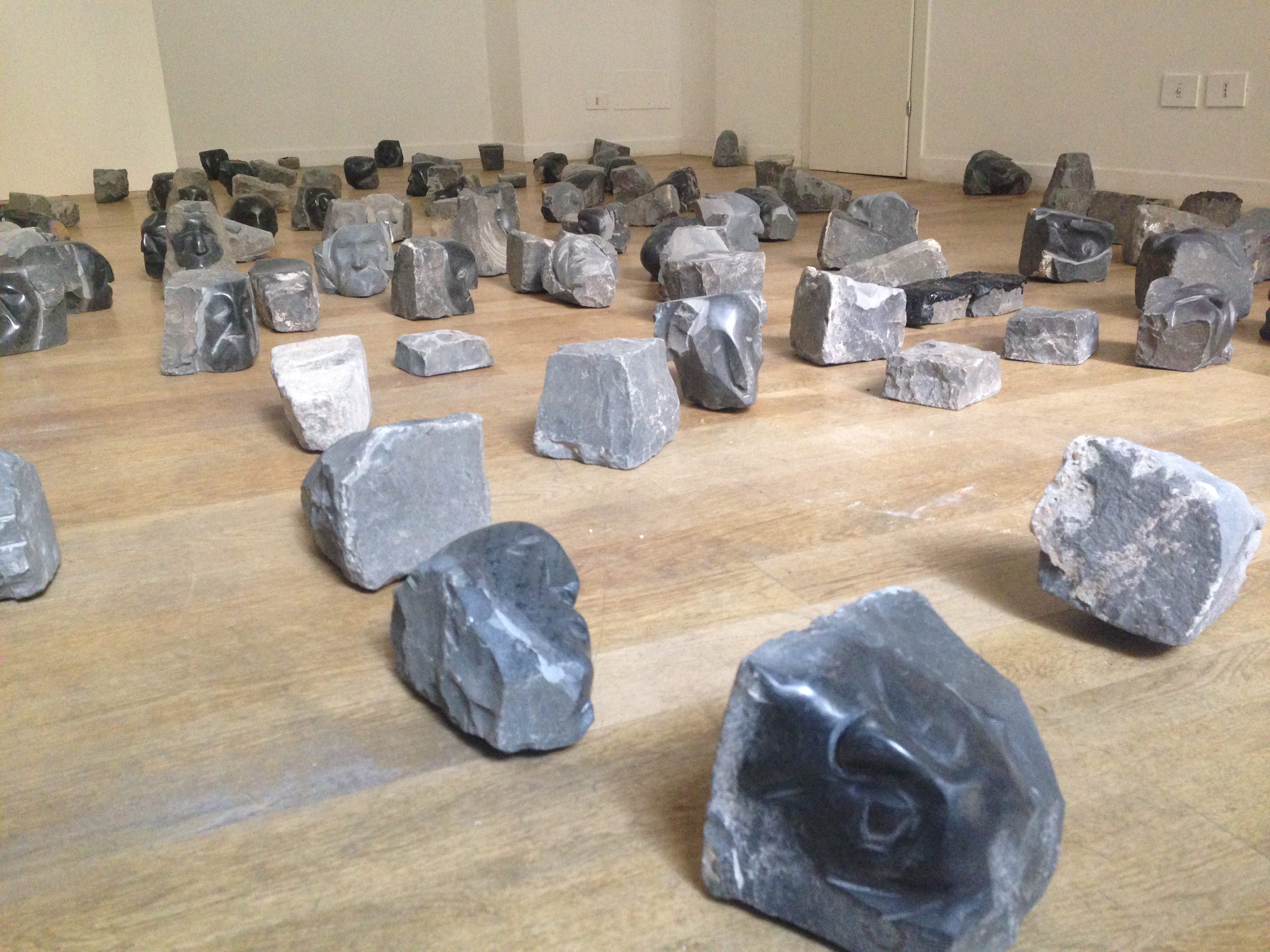 Le riflessioni dell’artista sul tema del lato nascosto, delle tracce lasciate inconsapevolmente dal peregrinare della gente, si trasformano in uno stimolo creativo il giorno in cui si imbatte in un mucchio di sanpietrini abbandonati vicino al Campo Boario, a Roma. Il sanpietrino è un materiale tanto resistente da essere usato per la pavimentazione delle strade, ma duro e faticoso da scolpire. Ogni blocchetto nero, rastremato e grossolanamente squadrato, è un blocco di leucitite, una roccia lavica dalla quale l’artista ricava un volto su una delle sei facce. Per la scultrice la sfida con il materiale è una lotta fisica, la metafora del lavoro duro e doloroso che si fa per scalfire le proprie placche rigide, che si formano nella psiche. Bisogna scavarle e non abbandonarle alla spersonalizzazione, all'oblio indifferenziato, come quello che proviamo verso il lastricato stradale. Come racconta l’artista, nel percorso faticoso di ritrarre, limare e lisciare ogni sanpietrino, ha cercato la forza per affrontare i propri blocchi, i più difficili, della sua vita personale. Da ogni pietra viene fuori un volto diverso, su una diversa faccia. Il sanpietrino diventa così un'icona colma di significati anche per gli abitanti delle stesse città. Un'icona invisibile a causa della sua quotidiana visibilità.