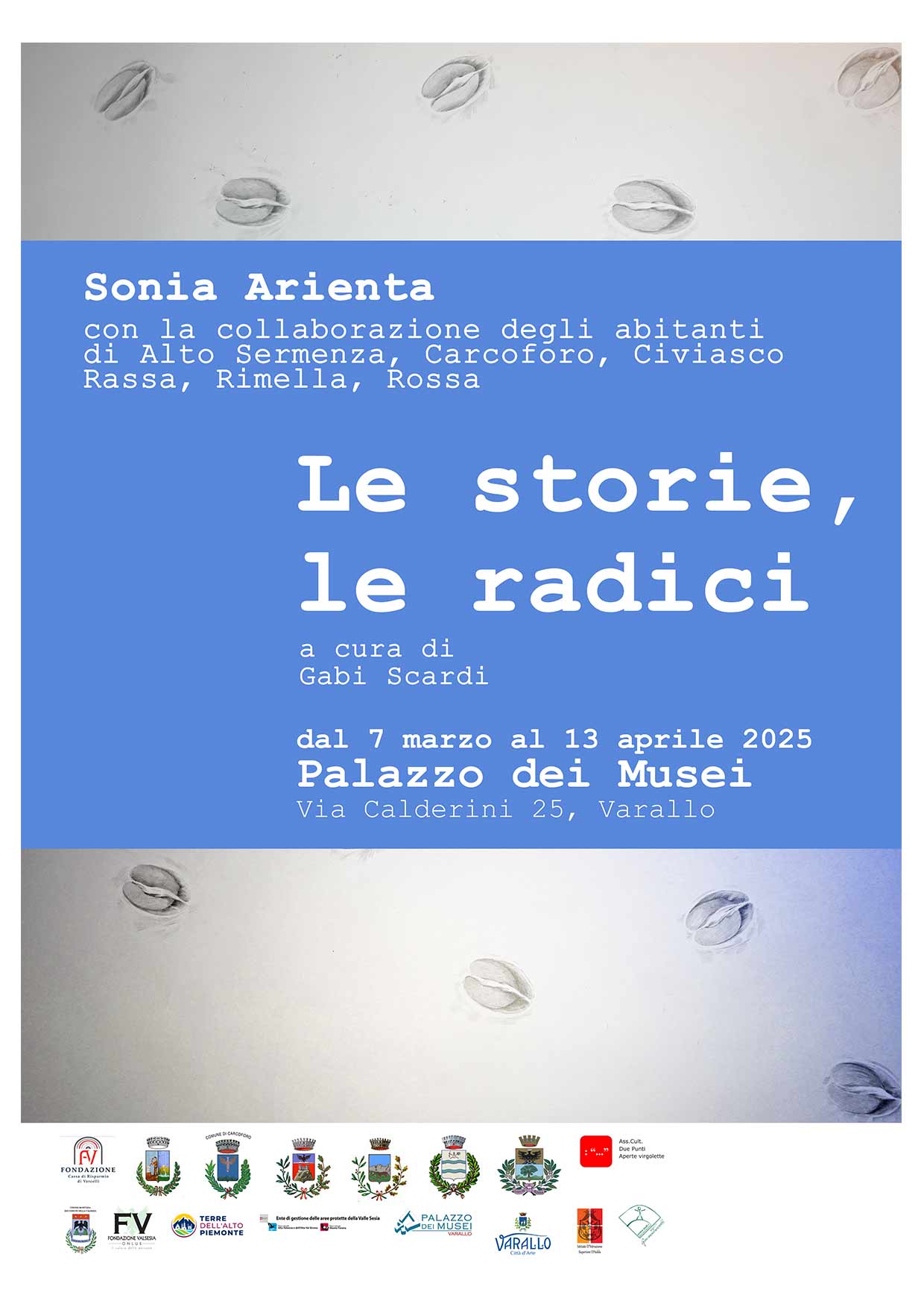 Nella sede espositiva della ex chiesa di San Carlo, all’interno del complesso di Palazzo dei Musei di Varallo (VC) dal 7 marzo al 13 aprile 2025 sarà possibile visitare “Le storie, le radici”, è la restituzione al pubblico del lavoro effettuato dal Sonia Arienta, drammaturga testuale-visiva e ricercatrice con gli abitanti e i villeggianti storici dei Comuni di Alto Sermenza, Carcoforo, Civiasco, Rassa, Rimella e Rossa, nel corso del progetto di drammaturgia montana partecipata “Nidi, nodi. Fluidi”, curato da Gabi Scardi. Inaugurazione venerdì 7 marzo, ore 18.00, Via Giovanni Calderini, 25, 13019 Varallo VC (0163 51424).
