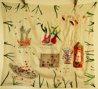 In mostra, accanto ai quadri cuciti di Sophie, anche i libri che ha illustrato per la casa editrice Adelphi.