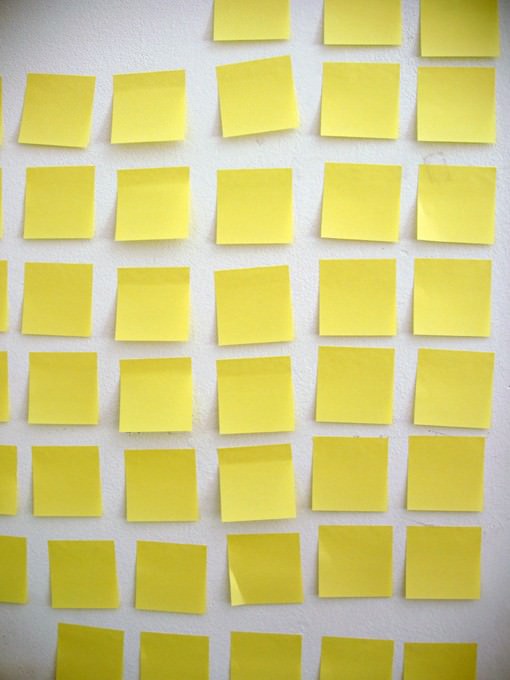 Incollare tutta una stanza (le mura e le porte-finestre, tranne il soffitto e il pavimento) di post-it regolarmente, rende lo spazio completamente diverso, come una nuova materia sulle parete.