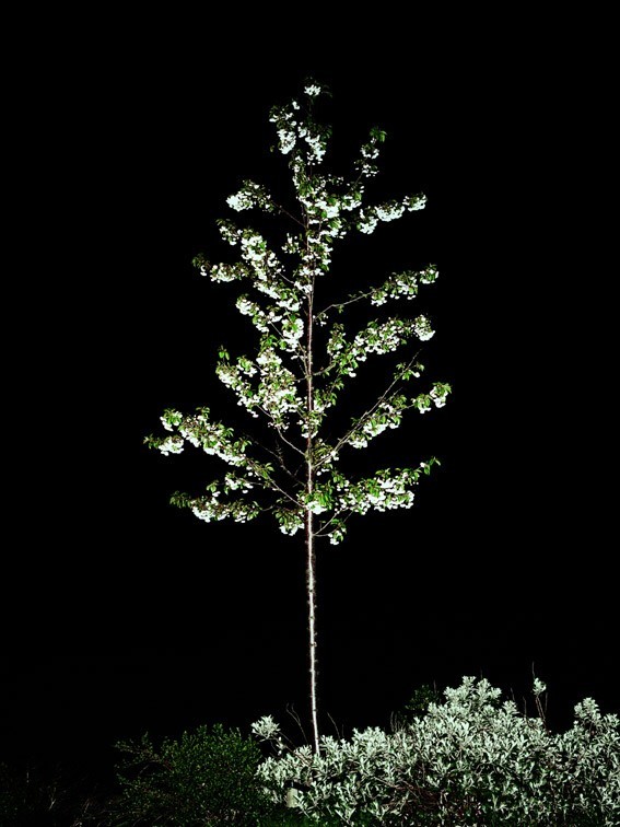 L’artista ha realizzato le fotografie della serie Twelve Trees durante visite ripetute nel corso dell’anno allo stesso luogo, il parcheggio di una stazione di servizio autostradale con dodici alberi. Ogni immagine mostra un albero che si staglia isolato su uno sfondo perfettamente nero ed è stata realizzata utilizzando le modalità e le apparecchiature proprie dello studio fotografico. Lo studio è stato trasferito all’esterno e ampliato per adattarsi e accogliere il set degli alberi. Il trasferimento sul luogo smorza e regola le discordanze e le irregolarità dell’ambientazione esterna. Scelta formale e, nello stesso tempo, concettuale, in quanto formalizza ogni singolo albero e lo decontestualizza isolandolo dall’ambiente circostante (il parcheggio della stazione di servizio). In qualche modo questa scelta sembra accrescere l’individualità di ciascun albero, farne quasi un monumento, per esaminare minuziosamente e far risaltare i minimi dettagli che lo rendono unico e diverso da ogni altro. Ma, nello stesso tempo, c’è anche un significato nella serie degli alberi, che mette a fuoco le caratteristiche che definiscono la specie, e che fanno di un albero un esemplare di quella specie e non di un’altra, in nessun modo unico.