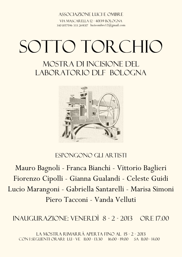 L’esposizione raccoglie le opere di alcuni degli artisti che frequentano il laboratorio di incisione della nota associazione culturale e artistica bolognese “Officina dell’Arte” (dlf Bologna).