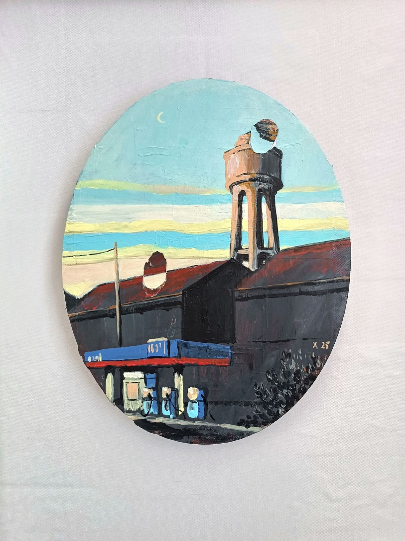 Nelle opere di Guglielmo Mattei siamo testimoni di un mondo che solo in apparenza rappresenta la realtà. Negli scorci urbani assistiamo all’abbandono dell’essere umano da luoghi in cui tutto era, e forse ora non è più. In atmosfere post-industrial ci racconta di uno sconfinamento che, più che fisico, diventa metafisico: dove al colonnato classico Mattei sostituisce una pompa di benzina o il parcheggio di un centro commerciale. E, anche se splende il sole, sentiamo imminente l’ora di un crepuscolo che avvolge ogni cosa.