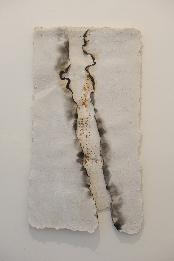 Marialuna Storti utilizza la carta e la rappresenta nelle sue diverse fasi. Interagendo con la materia, lascia molto alla natura delle cose, permettendo che l’autonomia della materia stessa delinei i confini e metta in scena le nostre fragilità. L’opera si autorappresenta e vive al di là dell’artista, compiendo un percorso sotto la guida della Storti che dosa con misura il proprio intervento: con delicatezza manipola, tenendo tra le dita — senza stringere, per non soffocare — gli elementi che diventano il materiale sensibile della nostra storia.