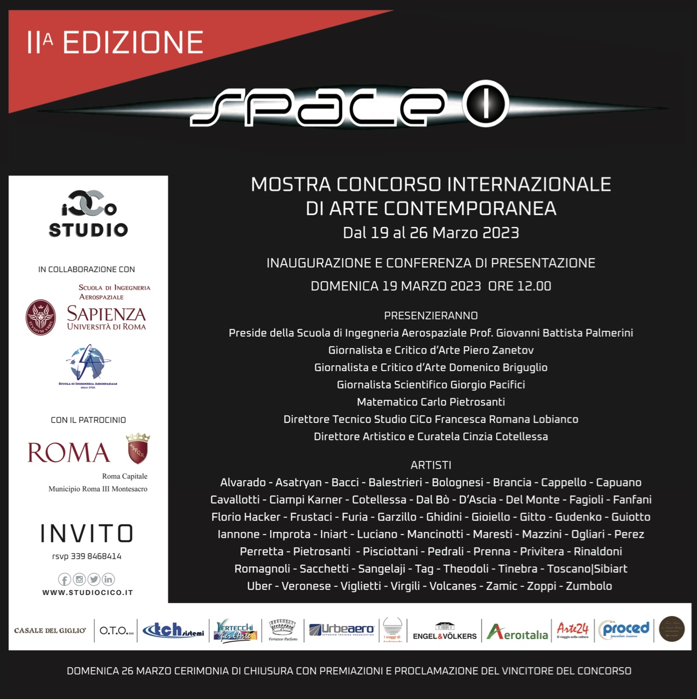 Domenica 19 marzo alle ore 12.00, la Galleria Studio CiCo inaugura la seconda edizione della Mostra-Concorso Internazionale di Arte Contemporanea SPACE ONE, in collaborazione con la Scuola di Ingegneria Aerospaziale dell’Università Sapienza di Roma e con il patrocinio del III Municipio del Comune di Roma.