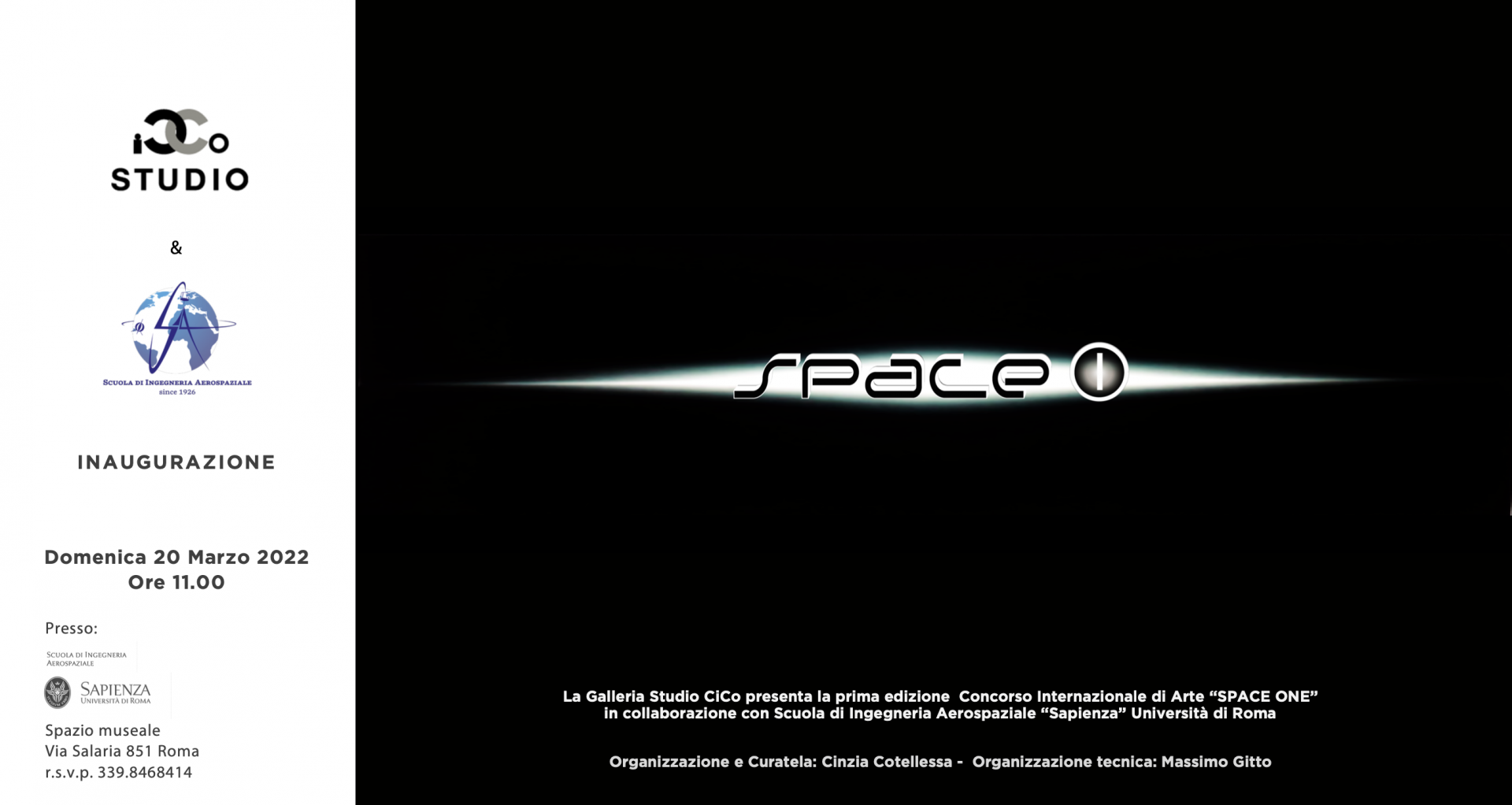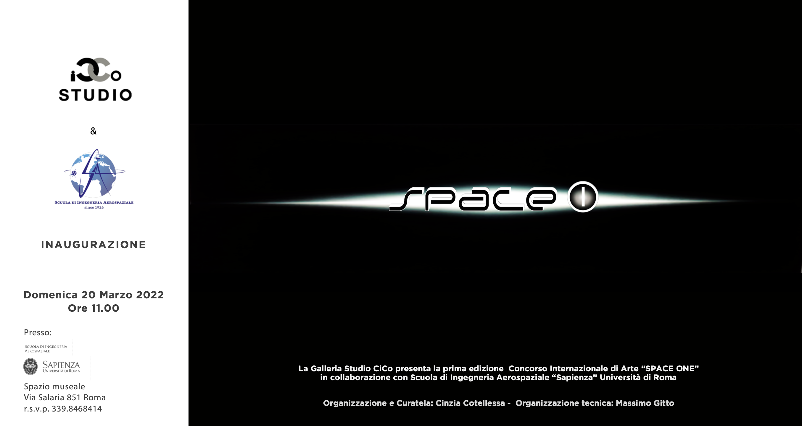 Domenica 20 Marzo 2022 si inaugurerà alle ore 12.00 la prima edizione della Mostra - Concorso Internazionale di Arte Contemporanea SPACE ONE, organizzata dalla Galleria Studio CiCo e promossa dalla Scuola di Ingegneria Aereospaziale La Sapienza di Roma. Saranno esposte cento opere tra dipinti a olio, acquarello, tecniche miste, sculture e installazioni create da Artisti di tutto il mondo espressamente per questa manifestazione.